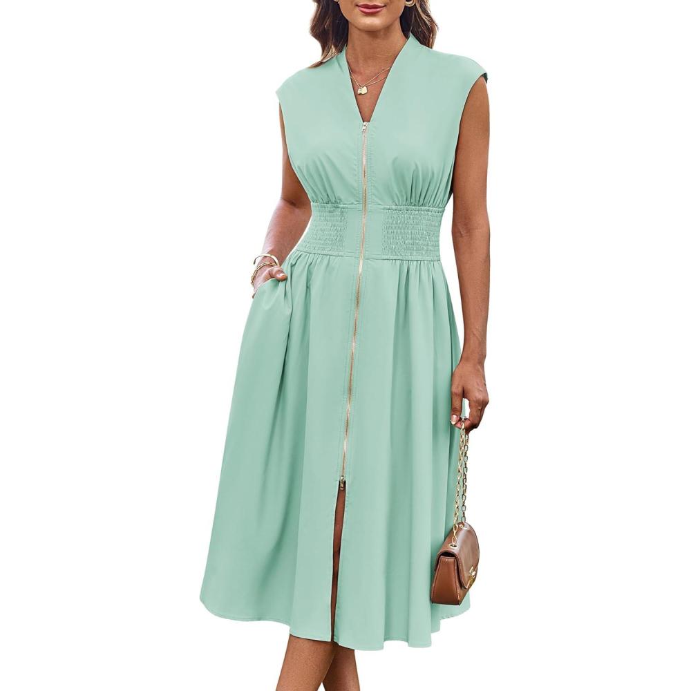 GRACE KARIN Womens Summer Casual Dress, Business Office Work Dresses, Cap Sleeve Zipper Front Flowy Midi Dress with Pockets(Sage Green)