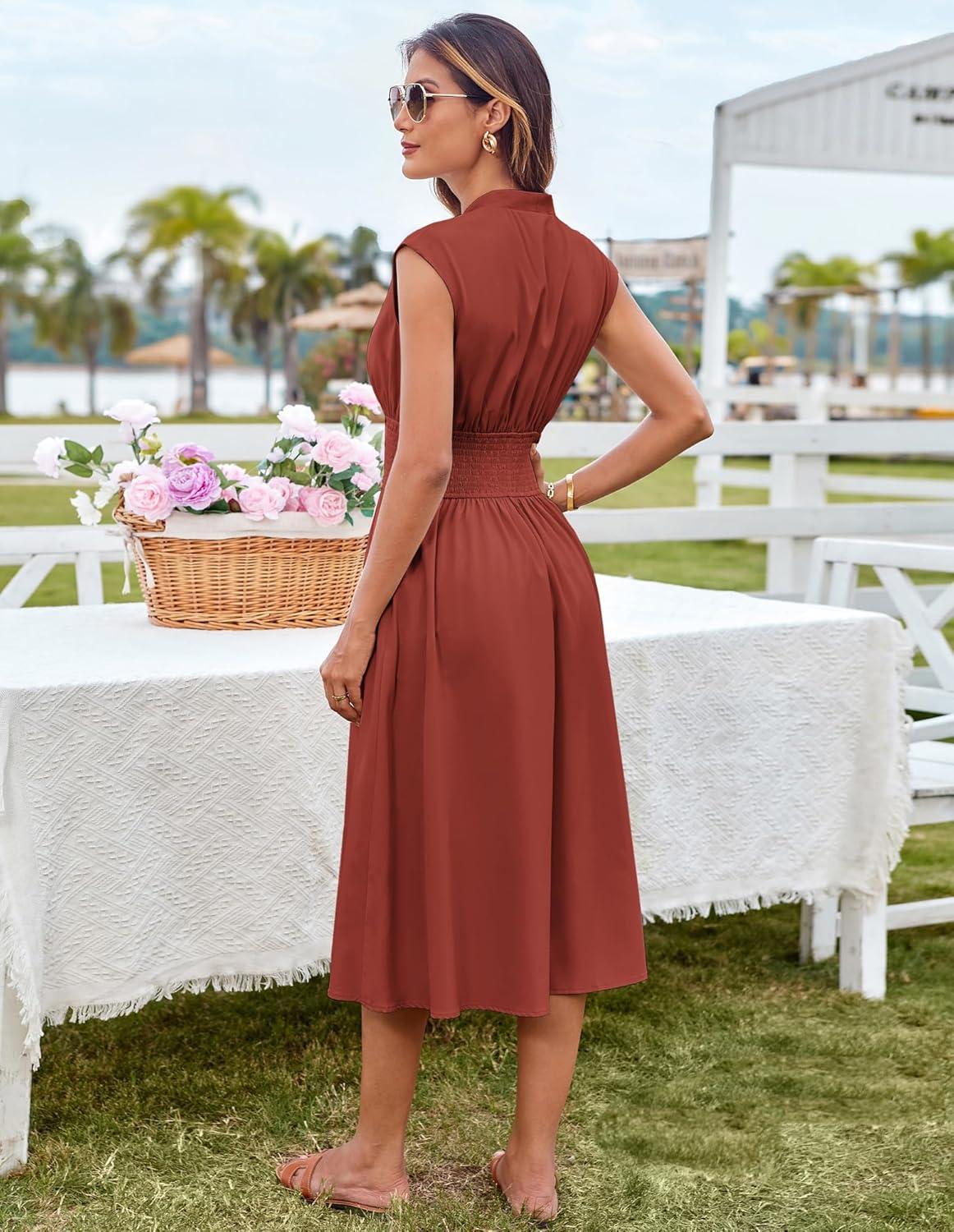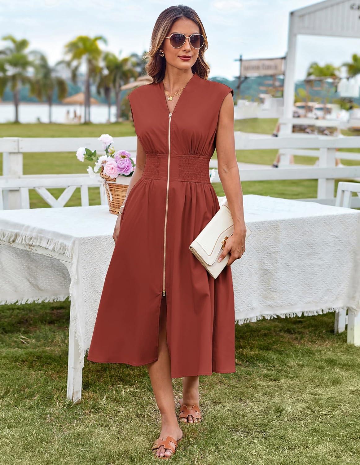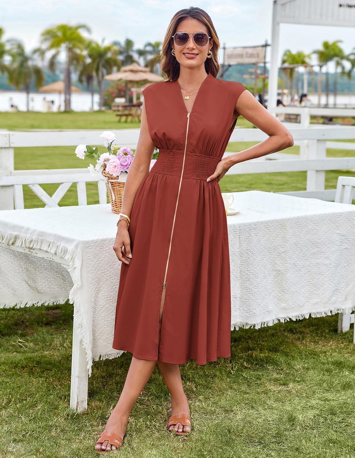 GRACE KARIN Womens Summer Casual Dress V Neck Cap Sleeve Zipper Front Flowy Midi Dress with Pockets(Rust Red)