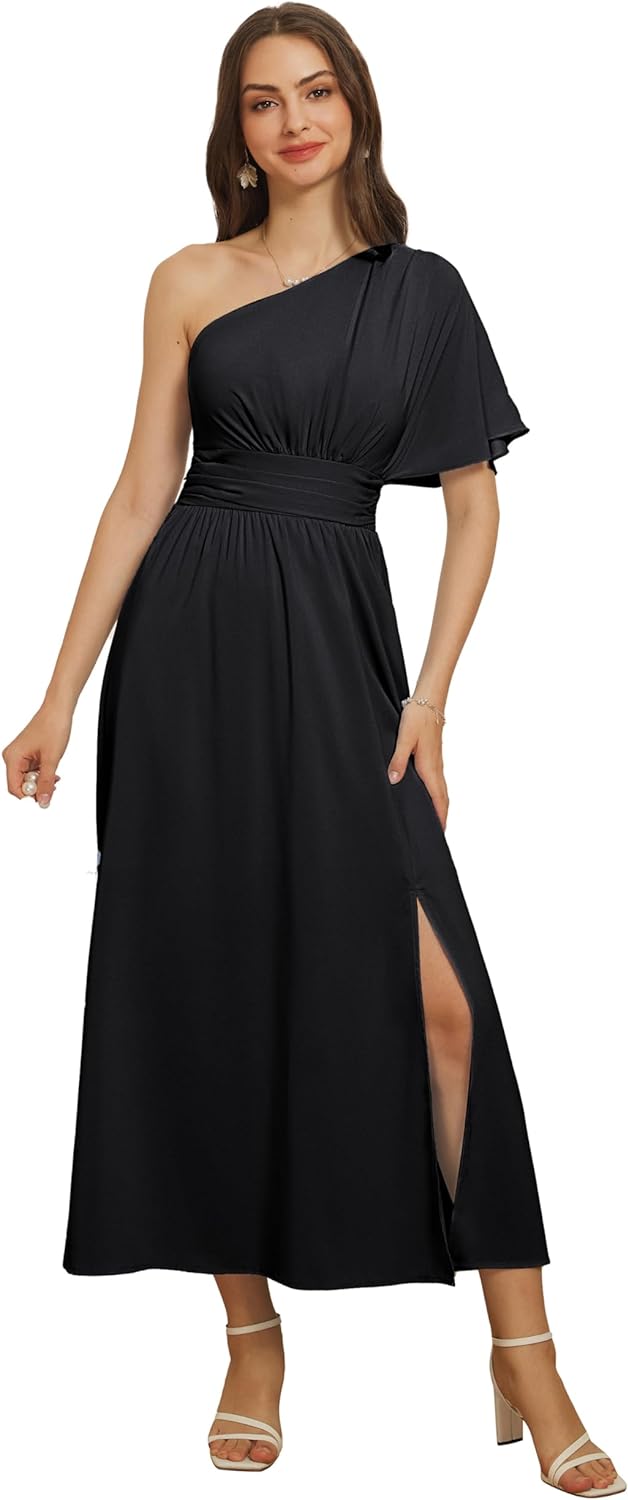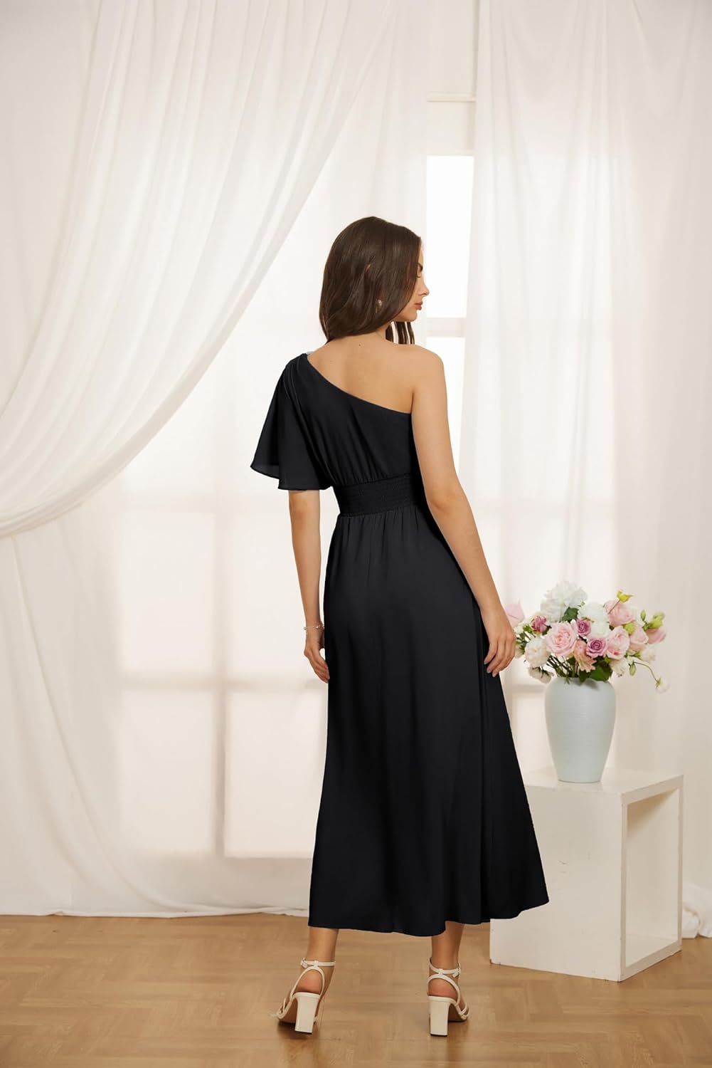 GRACE KARIN Women’s Summer Casual Flutter Short Sleeve One Shoulder A Line Flowy Beach Slit Midi Dress(Black)