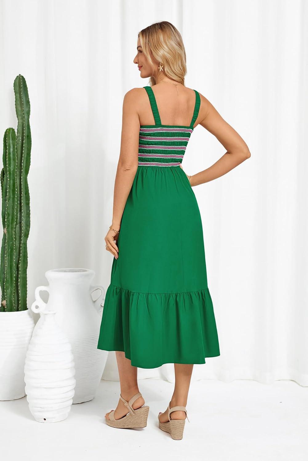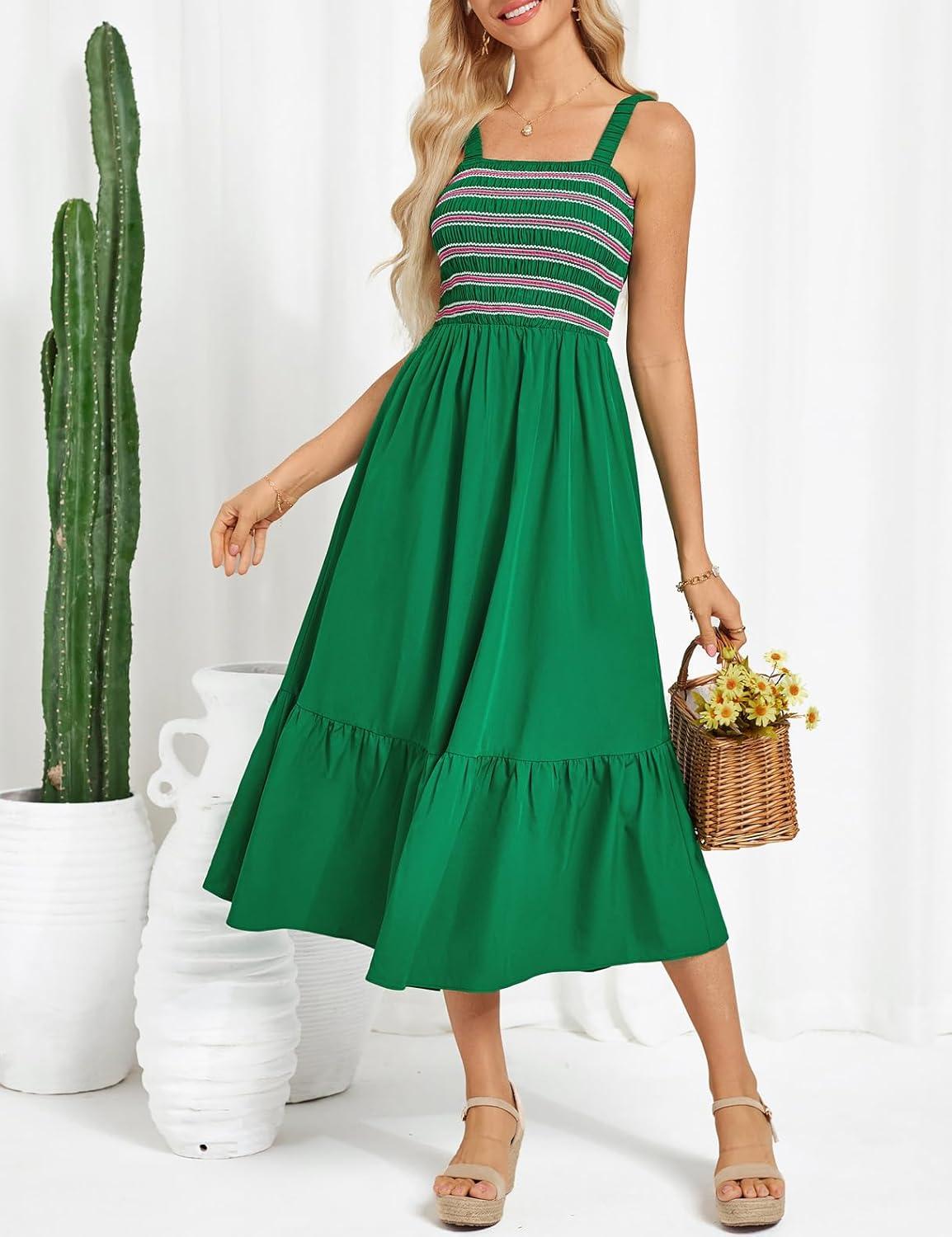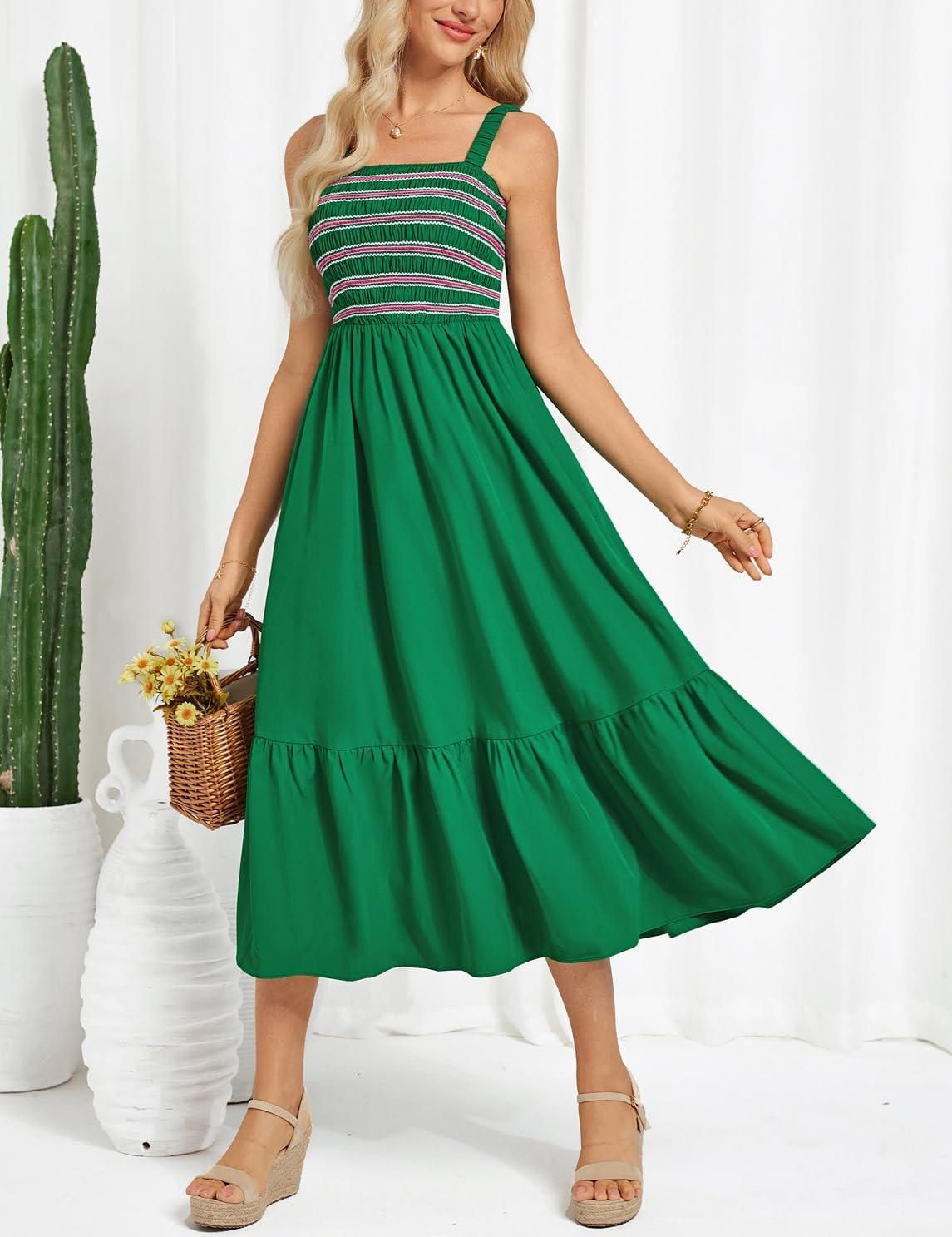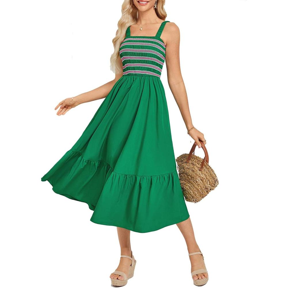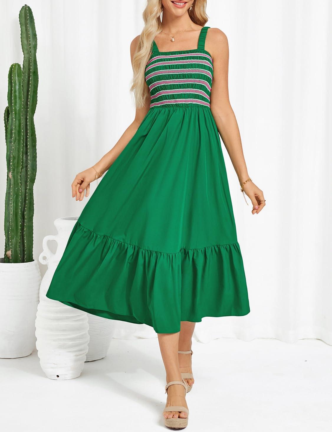 GRACE KARIN Women's Summer Casual Maxi Dress Sleeveless Spaghetti Strap Striped A-line Flowy Beach Sun Dresses with Pockets(Green)