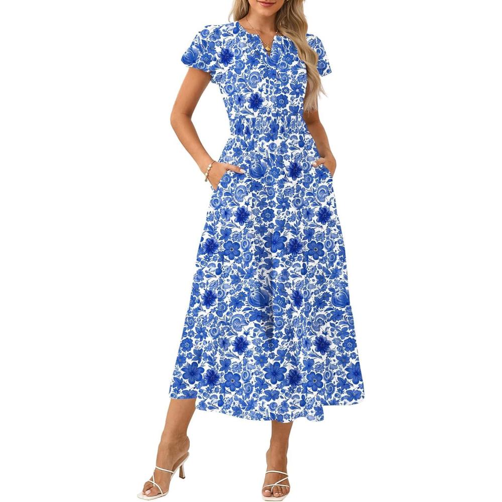 GRACE KARIN Womens Summer Dresses 2026 Casual Floral Puff Short Sleeve V Neck Dress A Line Flowy Boho Maxi Dress with Pockets(Blue Floral)