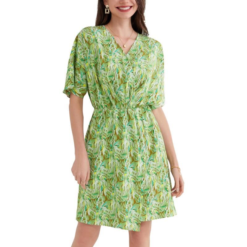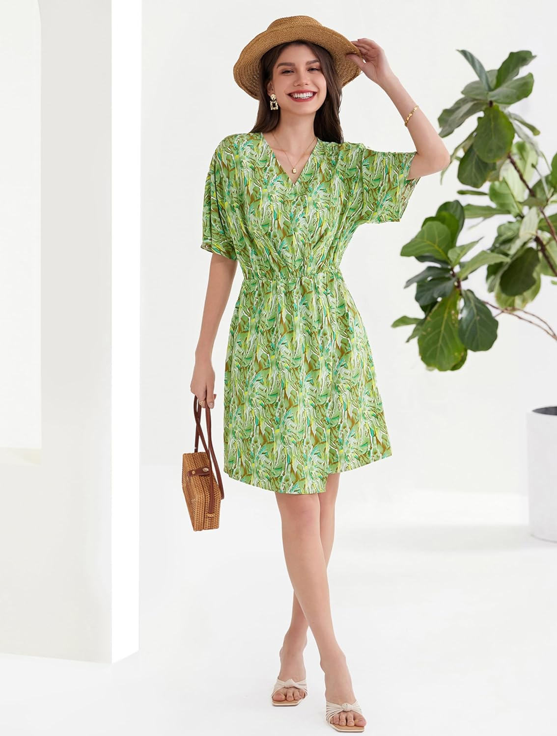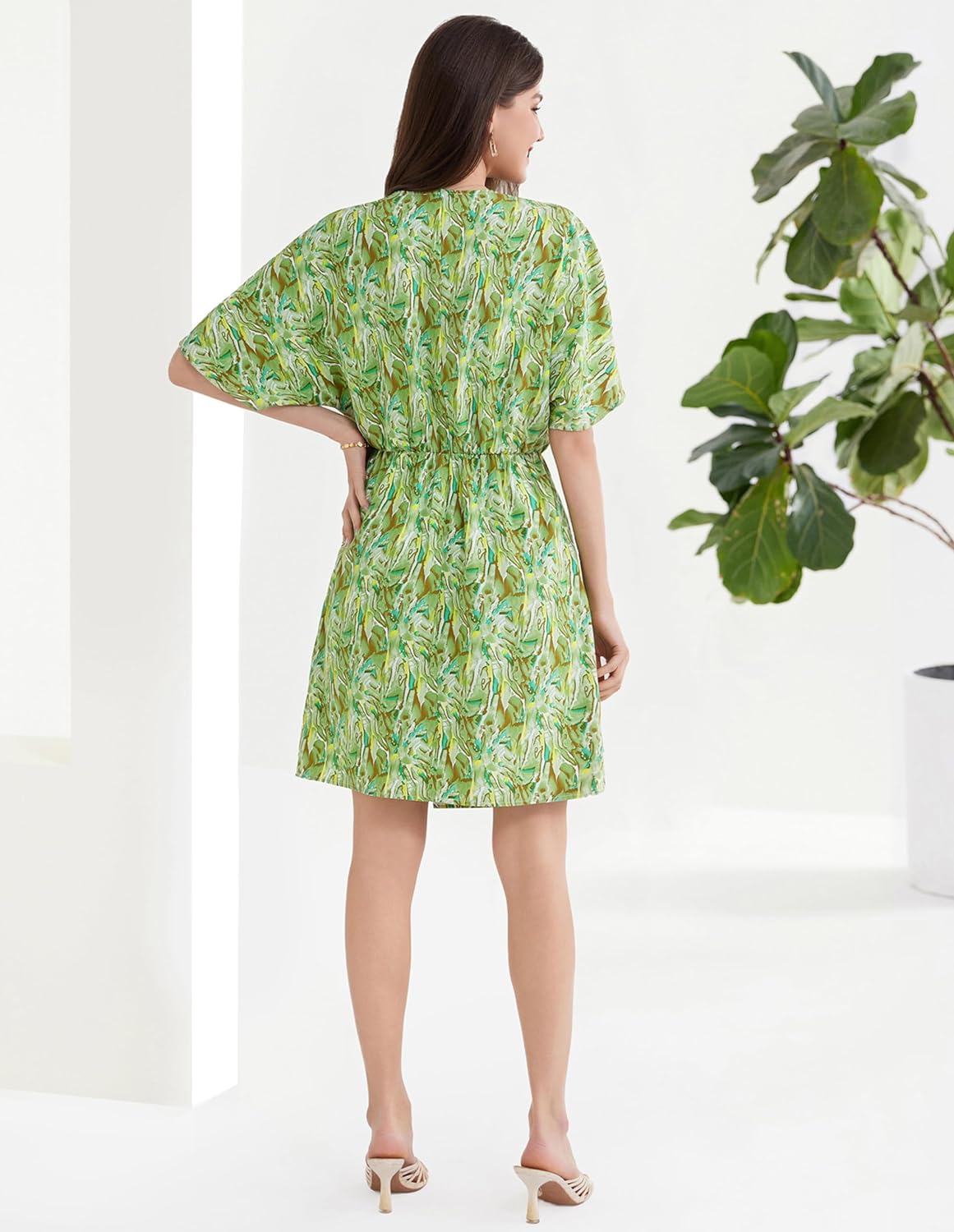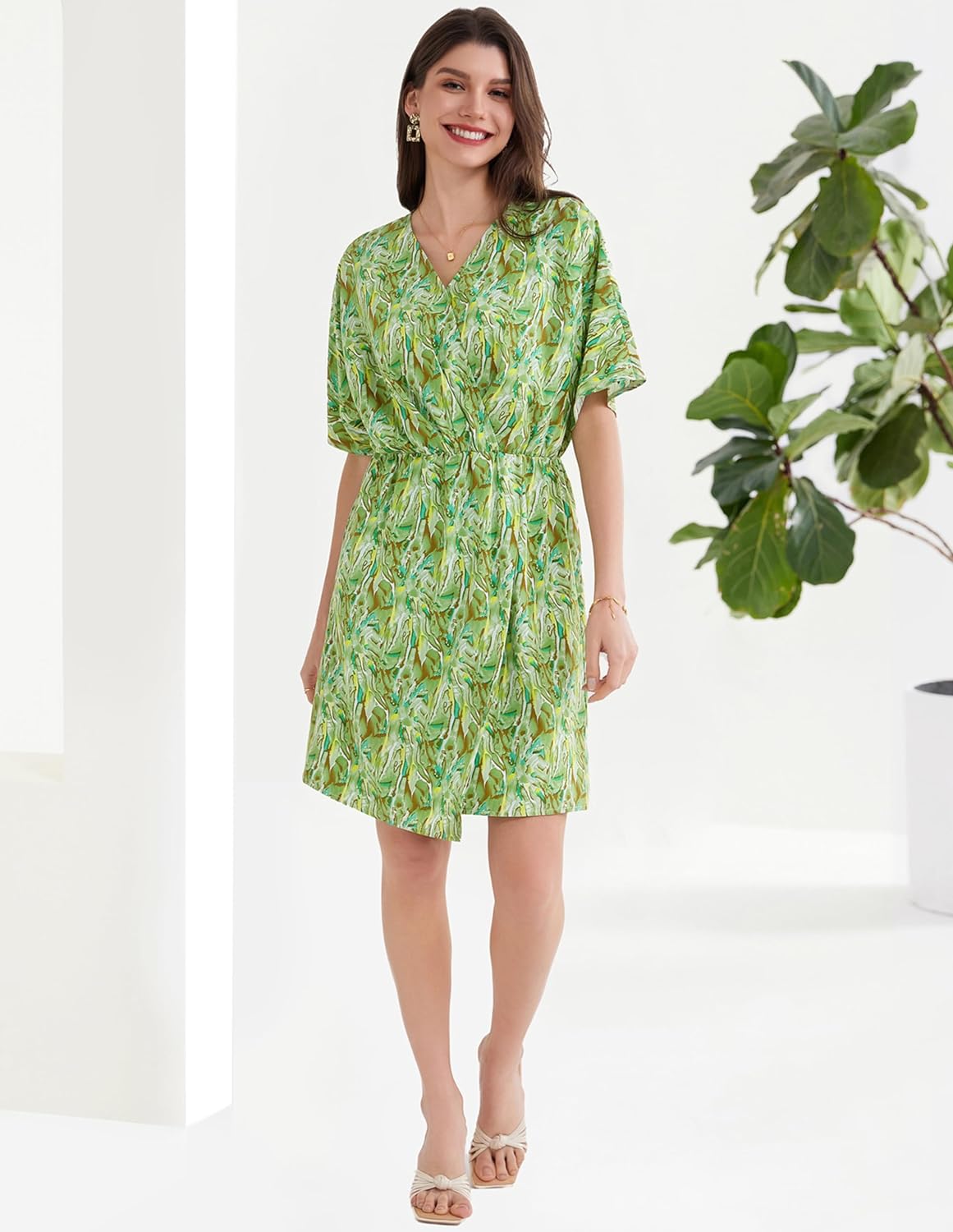GRACE KARIN Womens Summer Floral Dress Casual Wrap V Neck Short Sleeve Empire Waist A-Line Flowy Beach Boho Mini Dresses(Green Abstract Floral)