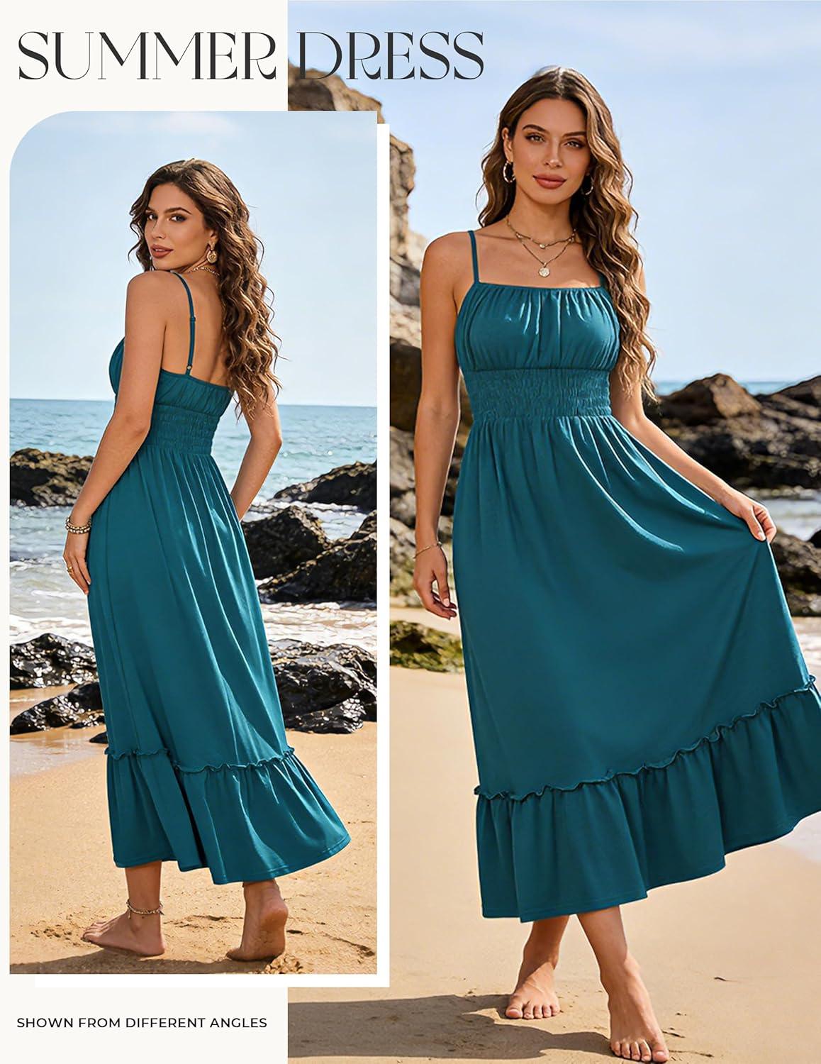 GRACE KARIN Women's Summer Maxi Dress 2026,Smocked Ruched Bust Sundress with Adjustable Straps & Pockets-Beach Vacation Dress(Teal)
