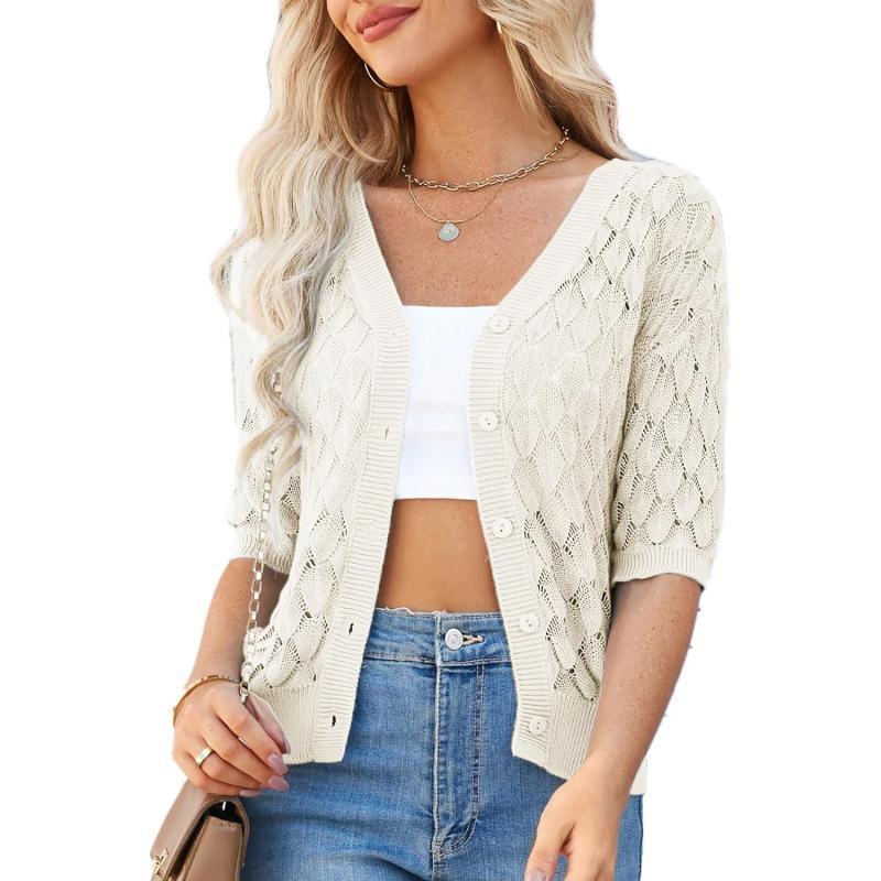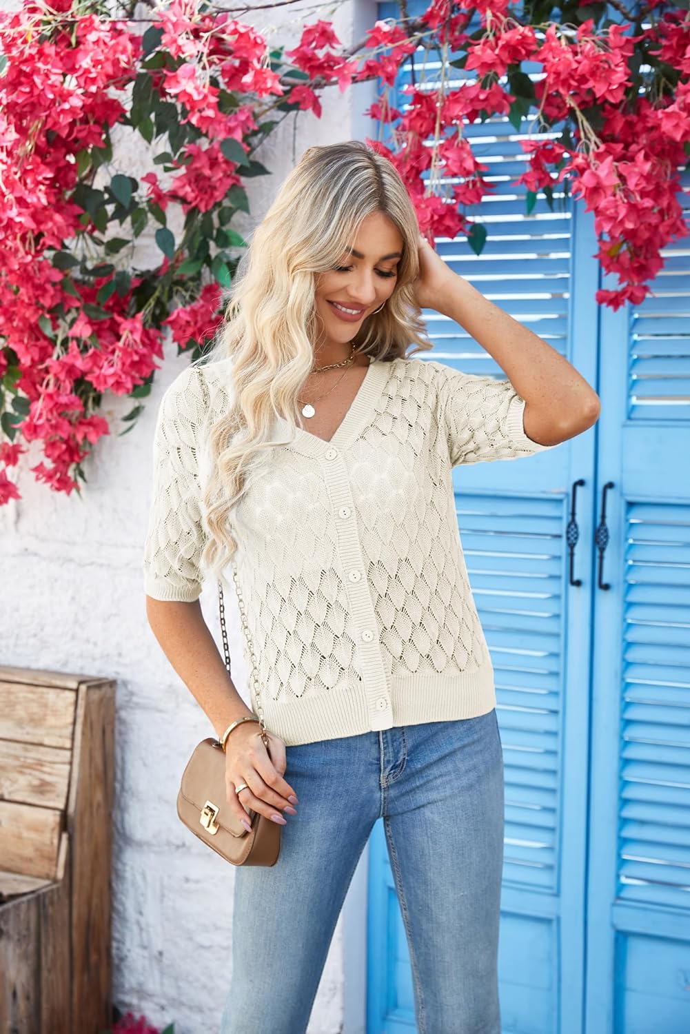 GRACE KARIN Womens Summer Short Sleeve Cropped Cardigan Sweaters Crochet Knit Shrug Open Front VNeck Button up TopsWhite