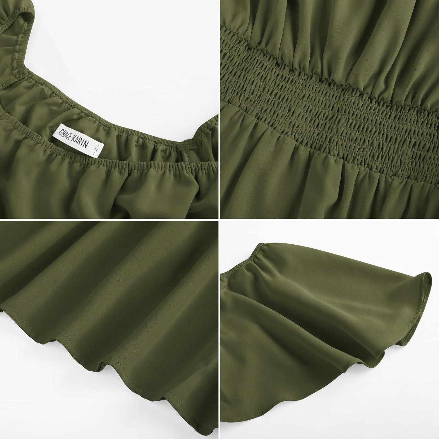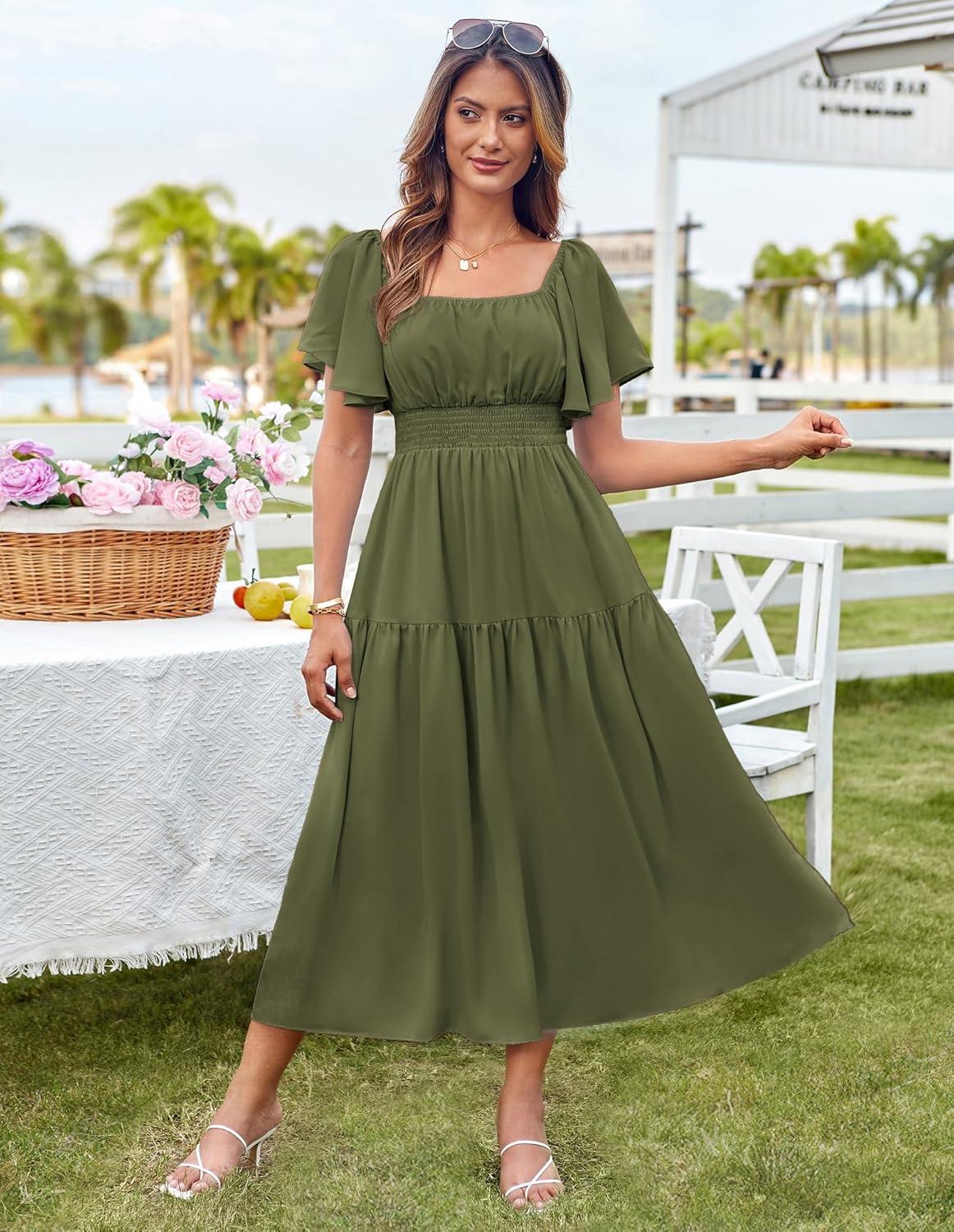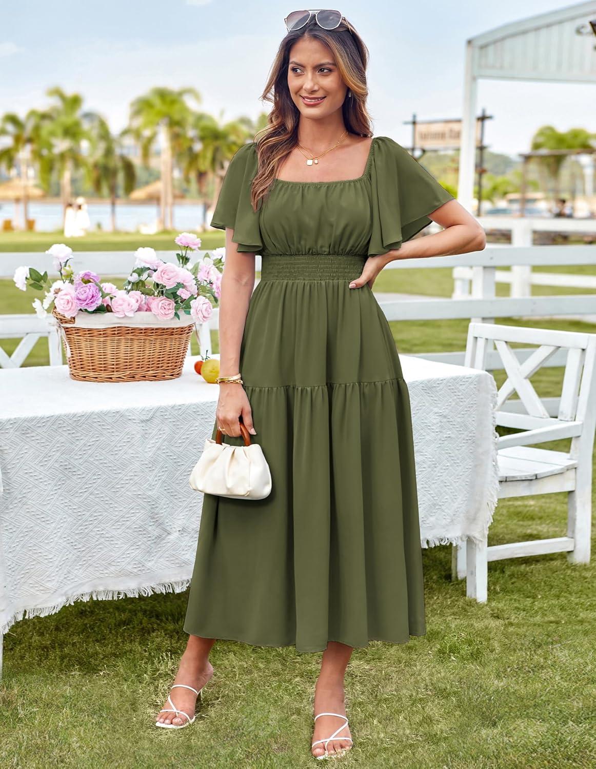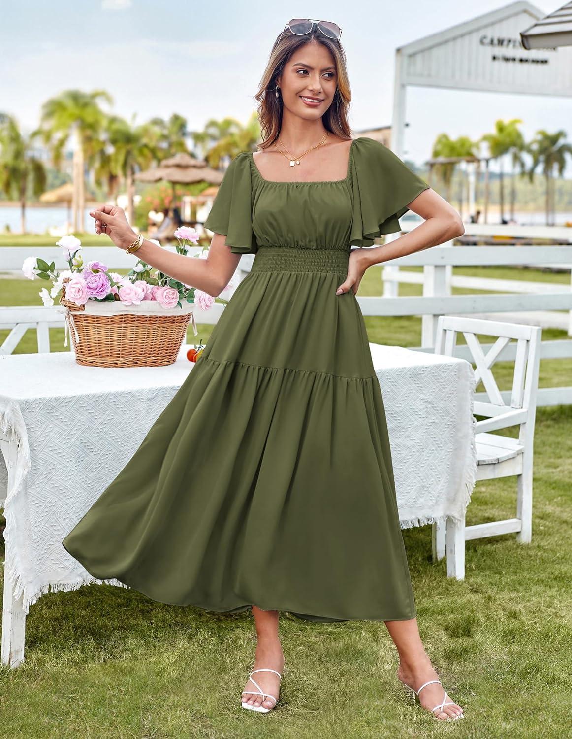 GRACE KARIN Women’s Summer Short Sleeve Square Neck Smocked Waist Casual Vacation Tiered Flowy Maxi Dress(Army Green)