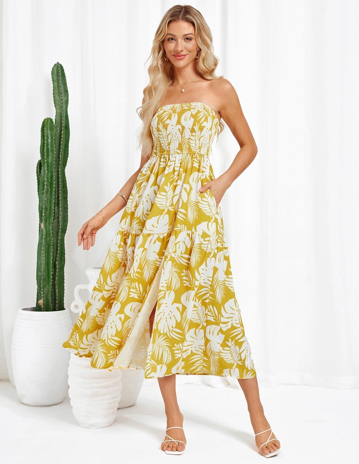 GRACE KARIN Women's Summer Strapless Dress Smocked Casual Beach Party Long Maxi Dresses with Pockets(Yellow)
