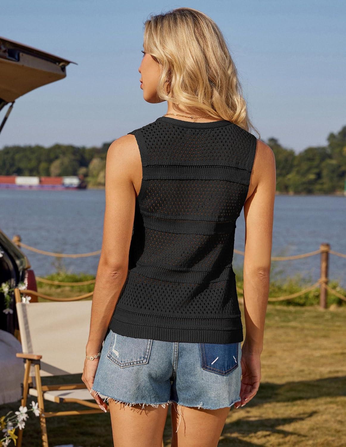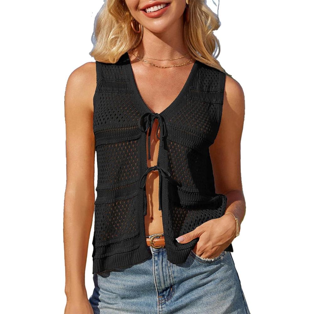 GRACE KARIN Women’s Tie Front Sweater Vest Summer Sleeveless Crop Crochet Knit Tops Lightweight Cardigan Sweaters Tops(Black)