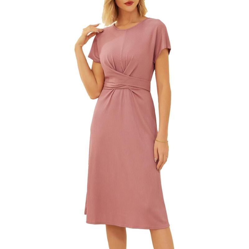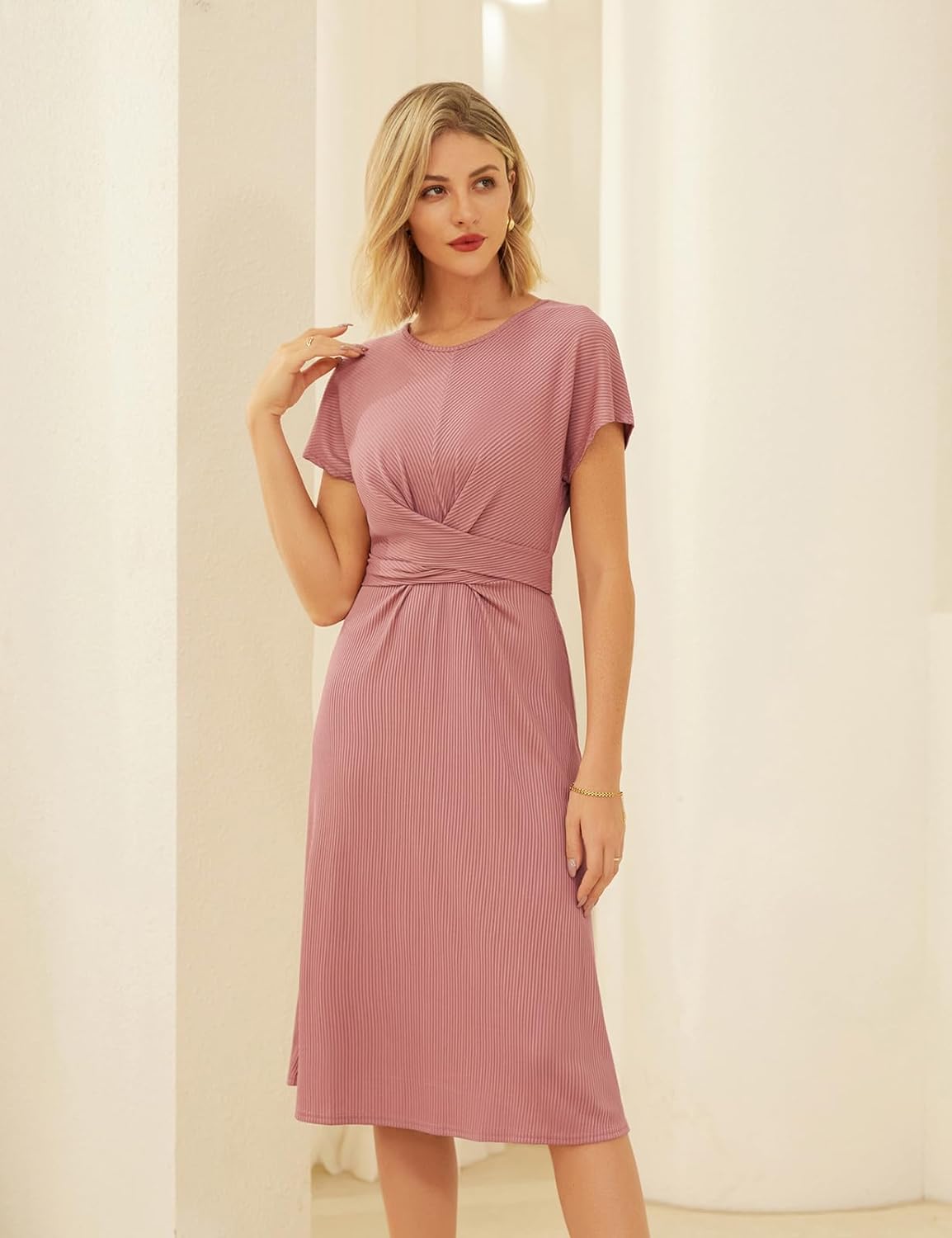GRACE KARIN Womens Tie Waist Summer Casual Midi Dress Short Sleeve Crew Neck Ribbed Knit DressGrey Pink