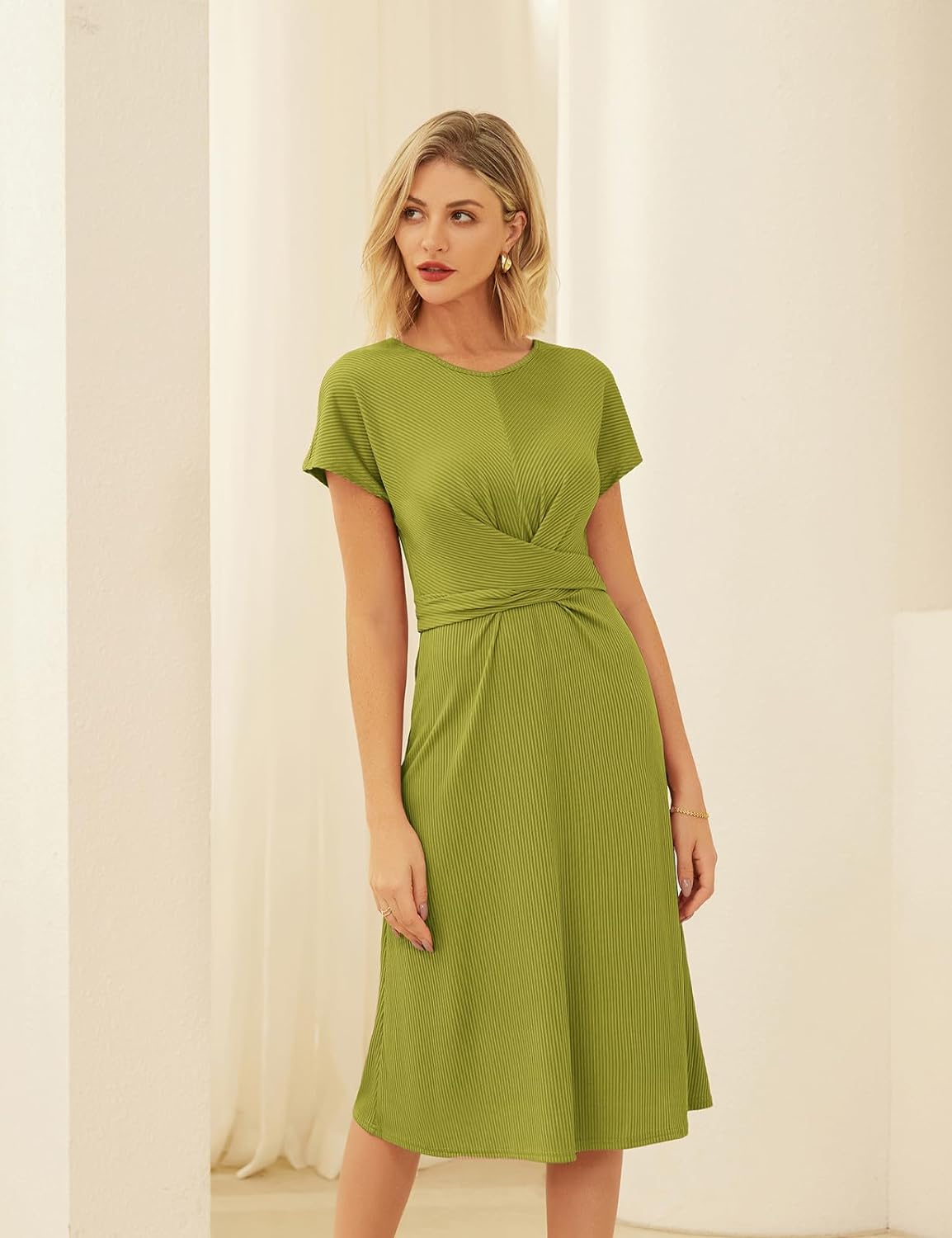 GRACE KARIN Women’s Tie Waist Summer Casual Midi Dress Short Sleeve Crew Neck Ribbed Knit Dress(Moss Green)