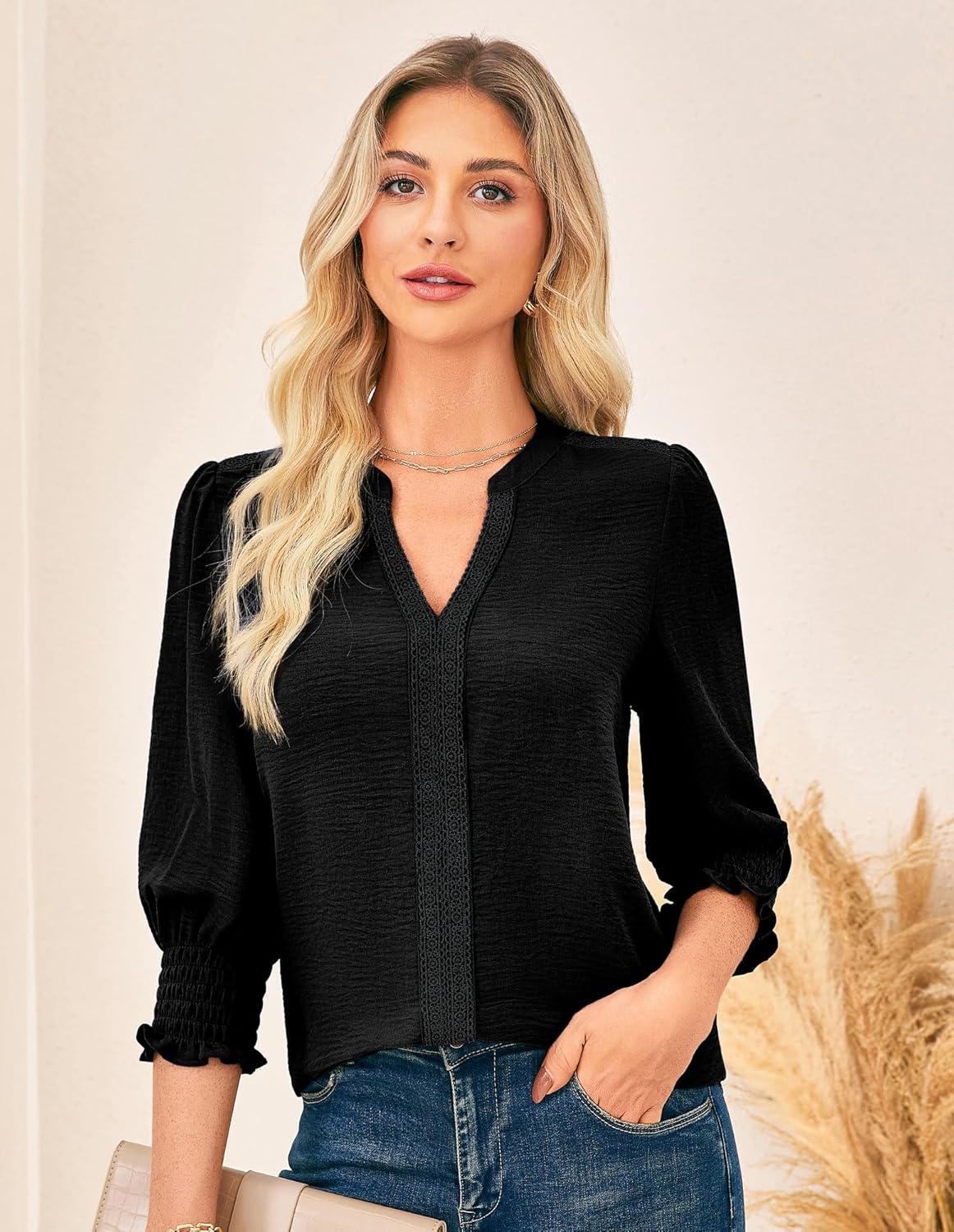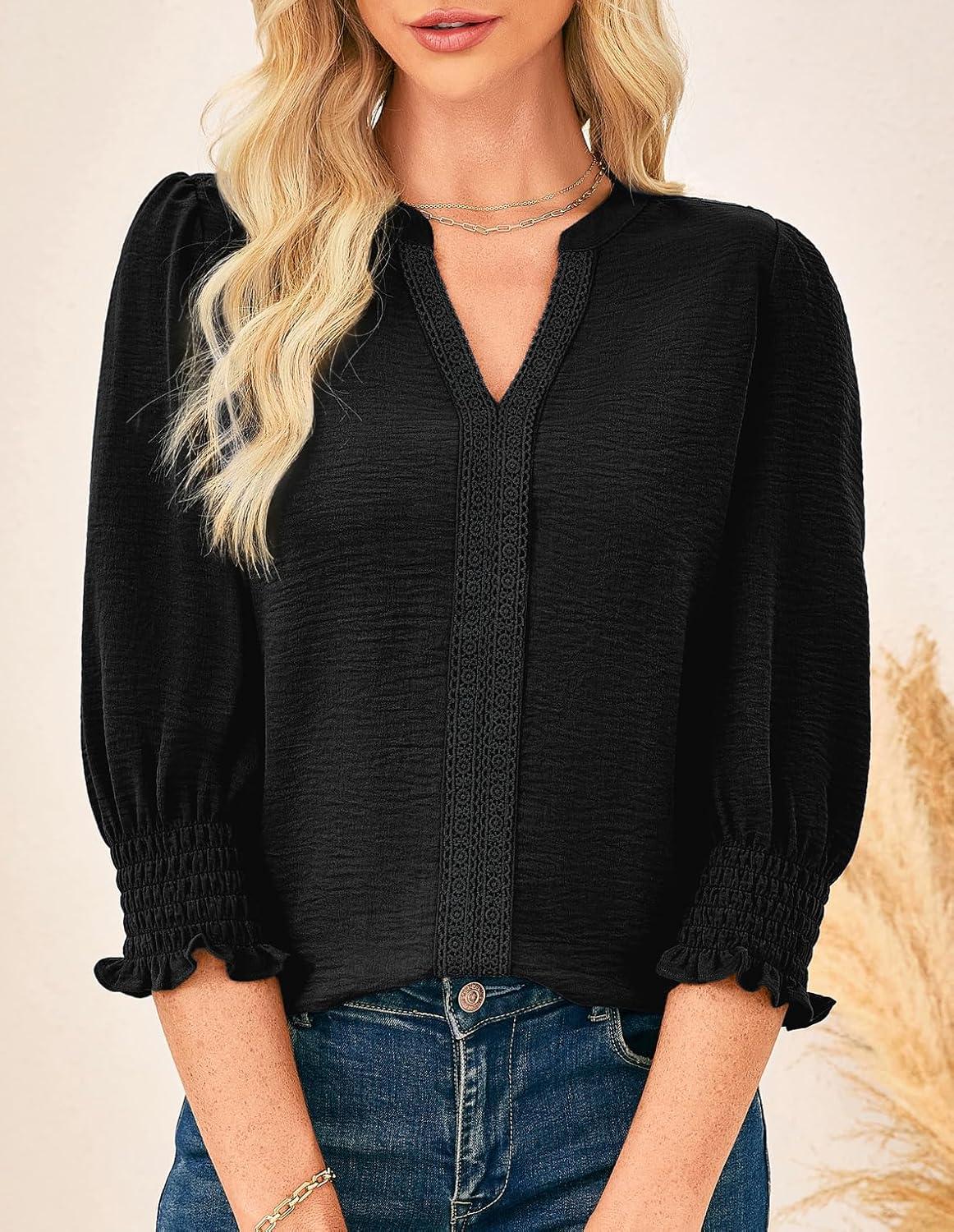 Get the GRACE KARIN Womens Tops Dressy Casual 3/4 Lantern Sleeve Lace Trim V Neck Tunics Business Work Blouses Trendy Fashion 2025(Black) you want at a discounted price during our markdown sale event.