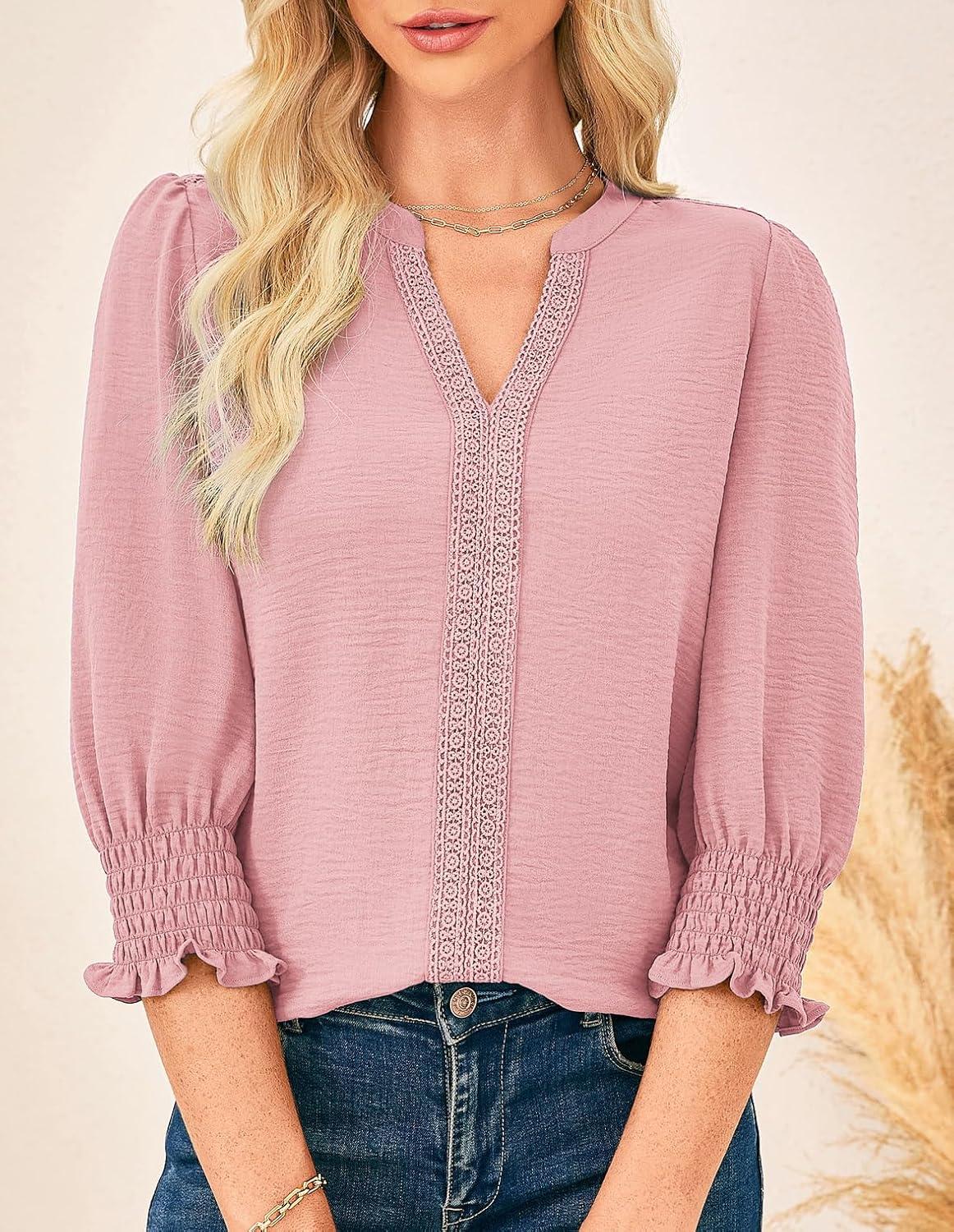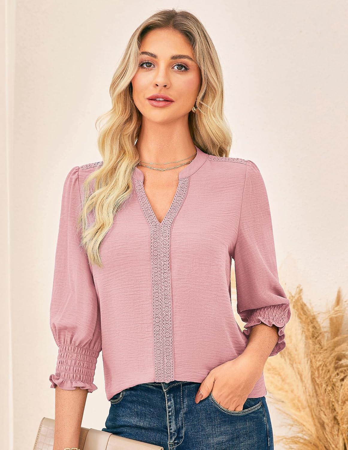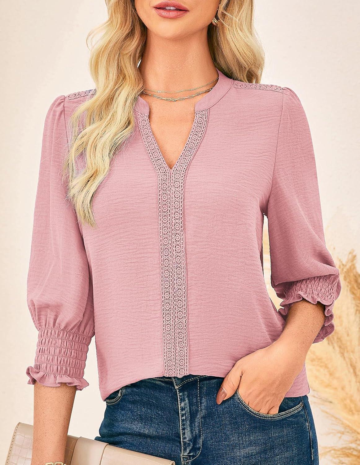 GRACE KARIN Womens Tops Dressy Casual 3/4 Lantern Sleeve Lace Trim V Neck Tunics Business Work Blouses Trendy Fashion 2025(Pink)