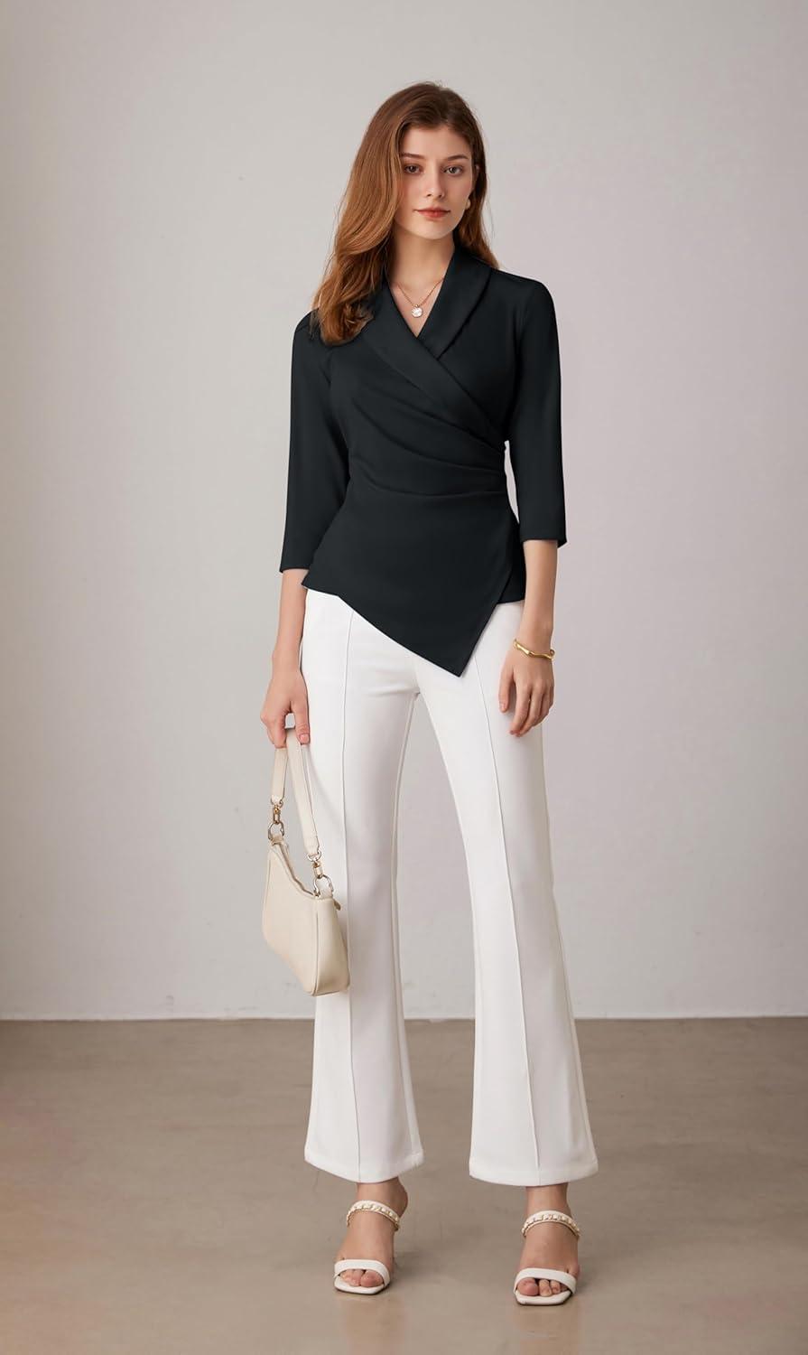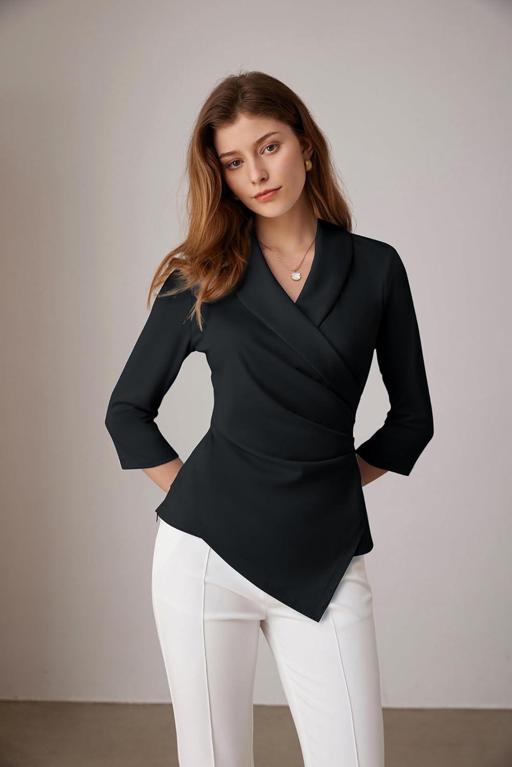 GRACE KARIN Women's V Neck Casual Work Tops 3/4 Sleeve Office Dressy Blouse Asymmetrical Elegant Shirts(Black)