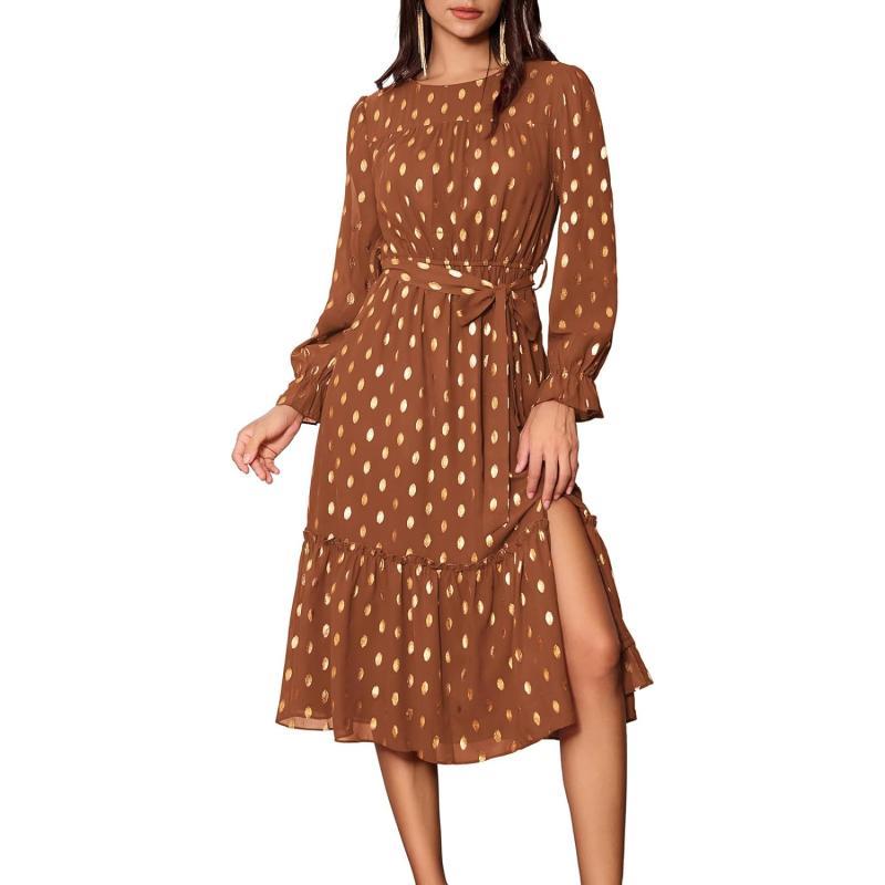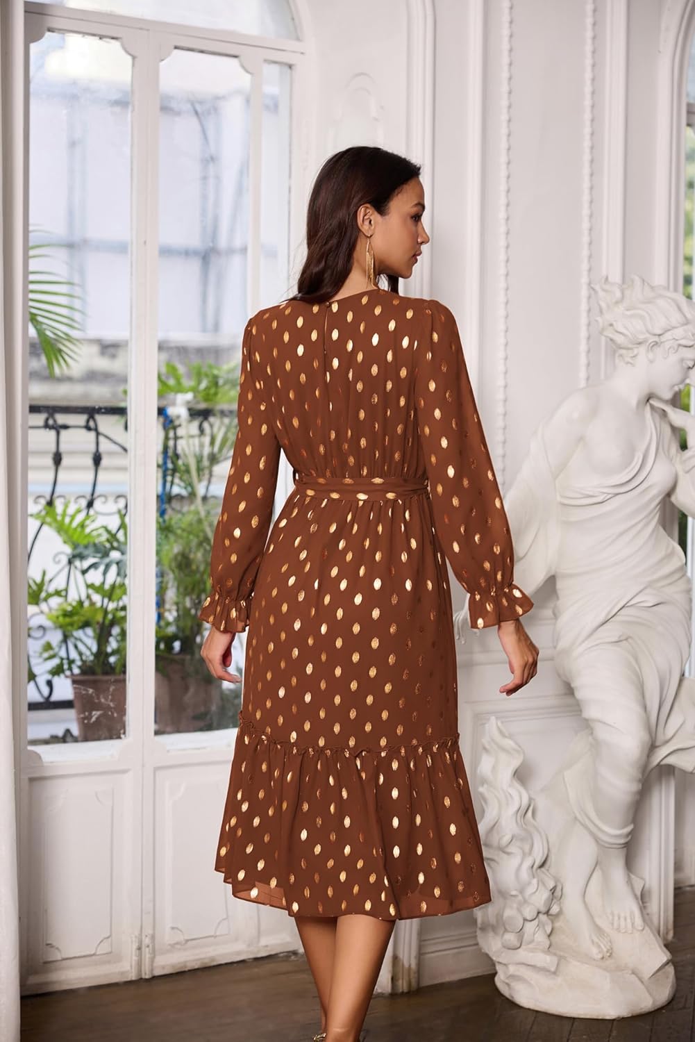 GRACE KARIN Women's V Neck Ruffle Sleeve Summer Dress 2023 Split Flowy Tiered Midi Dress Wedding Guest Cocktail Dresses(Long Sleeve Brown-gold Dots)