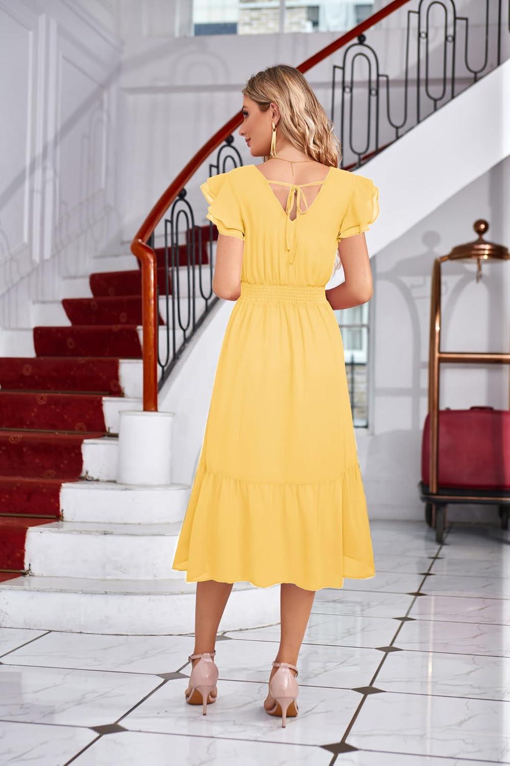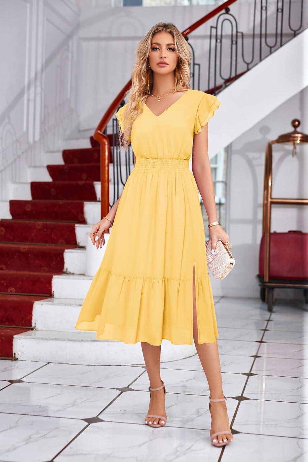GRACE KARIN Women's V Neck Ruffle Sleeve Summer Dress 2025 Split Flowy Tiered Midi Dress Wedding Guest Cocktail Dresses(Light Yellow-plain)