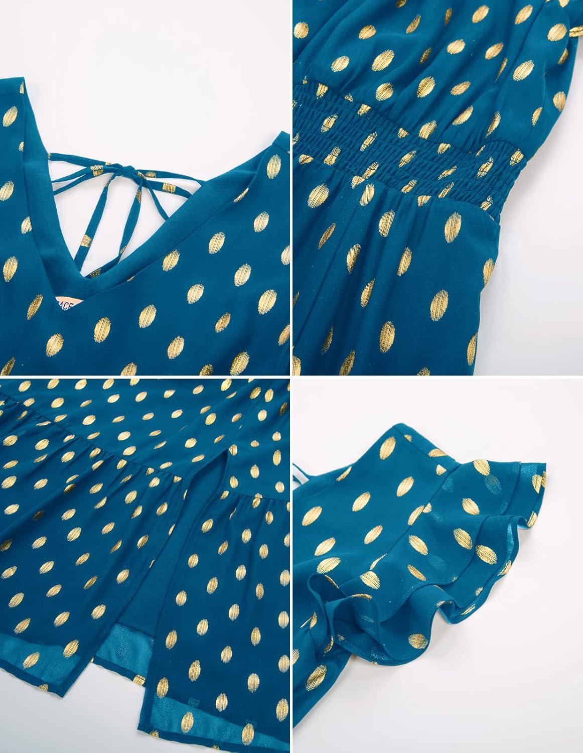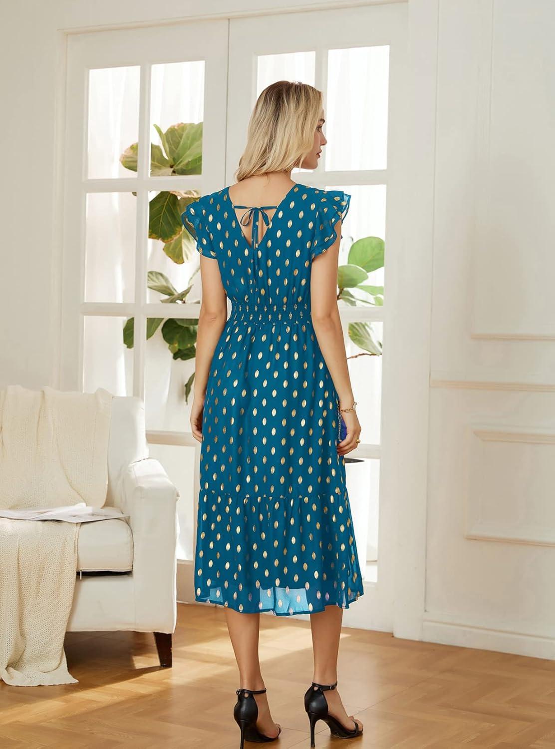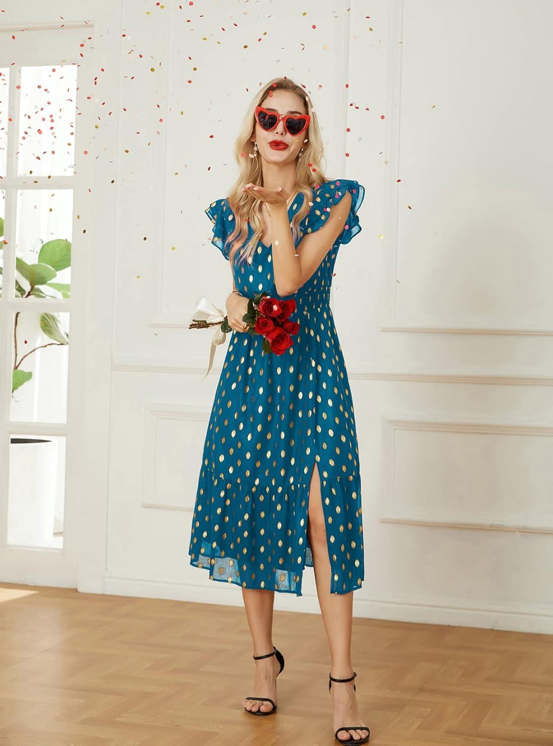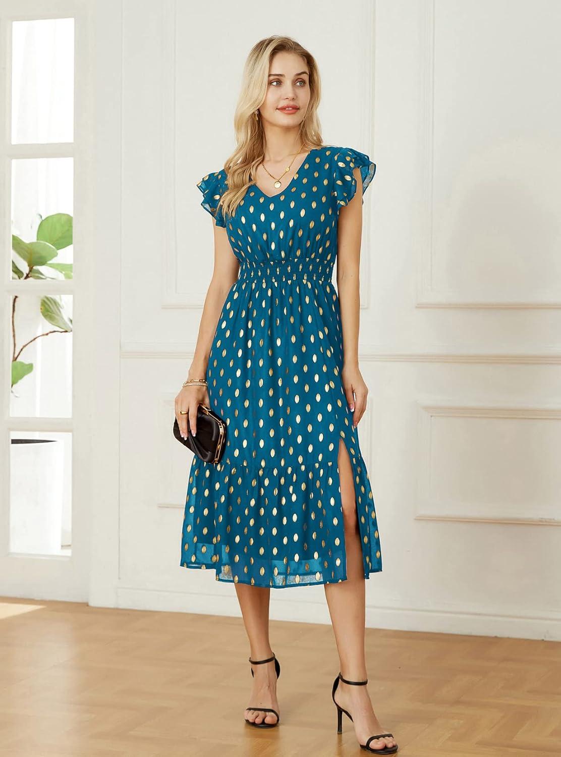 GRACE KARIN Women's V Neck Ruffle Sleeve Summer Dress 2025 Split Flowy Tiered Midi Dress Wedding Guest Cocktail Dresses(Peacock Blue-gold Dots)