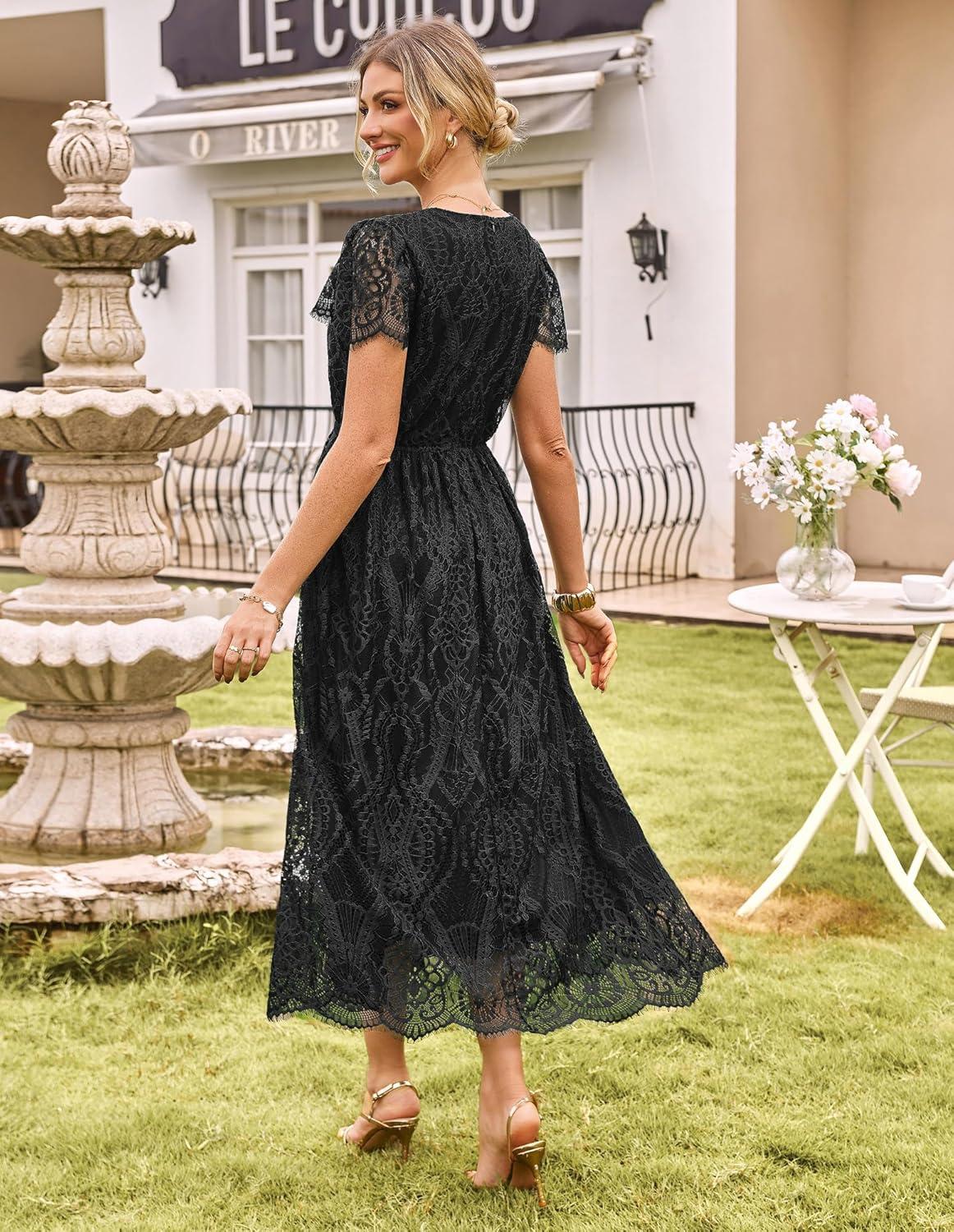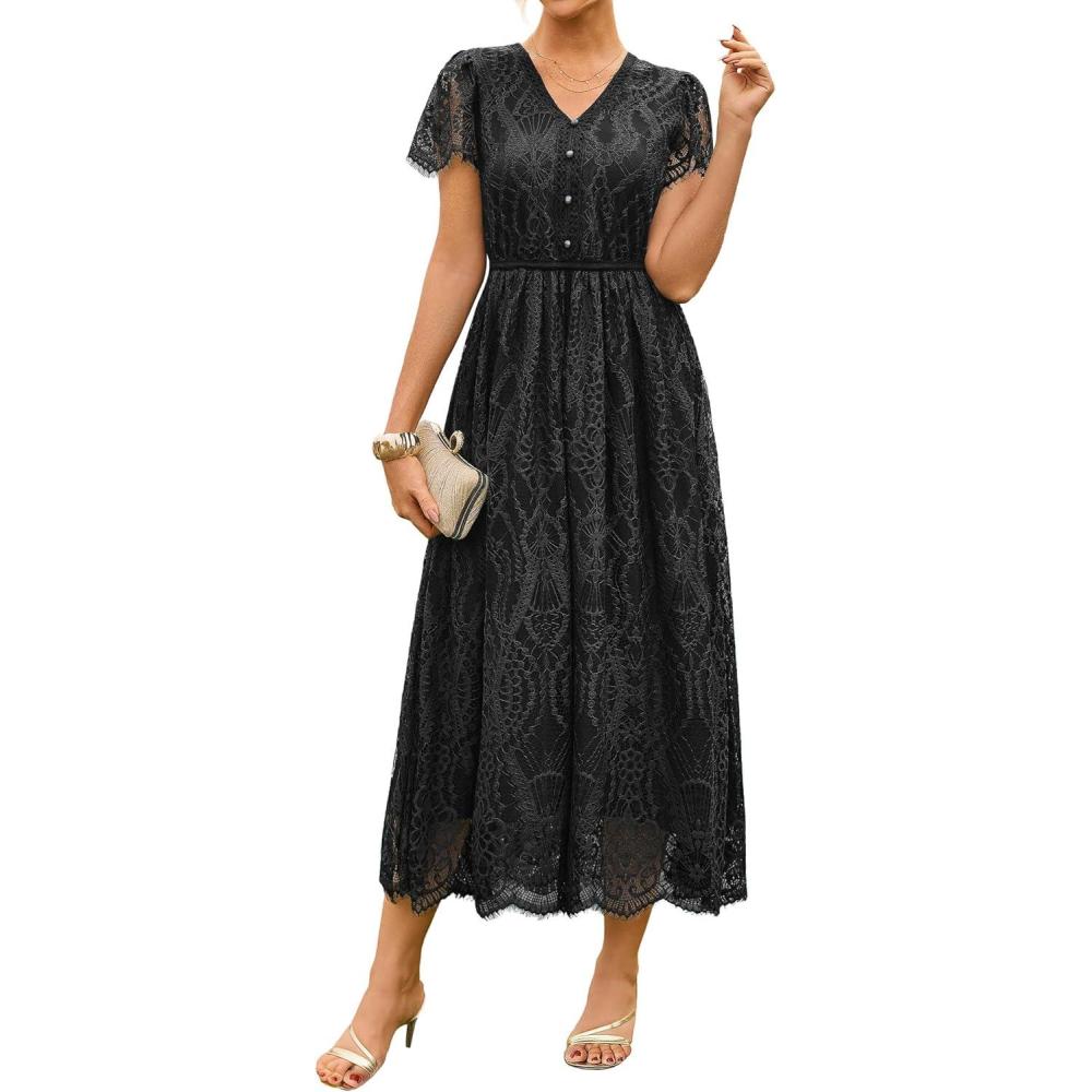 GRACE KARIN Women’s V Neck Short Sleeve Buttons Floral Lace Wedding Dress Bridesmaid Cocktail Party Maxi Dress(Black)