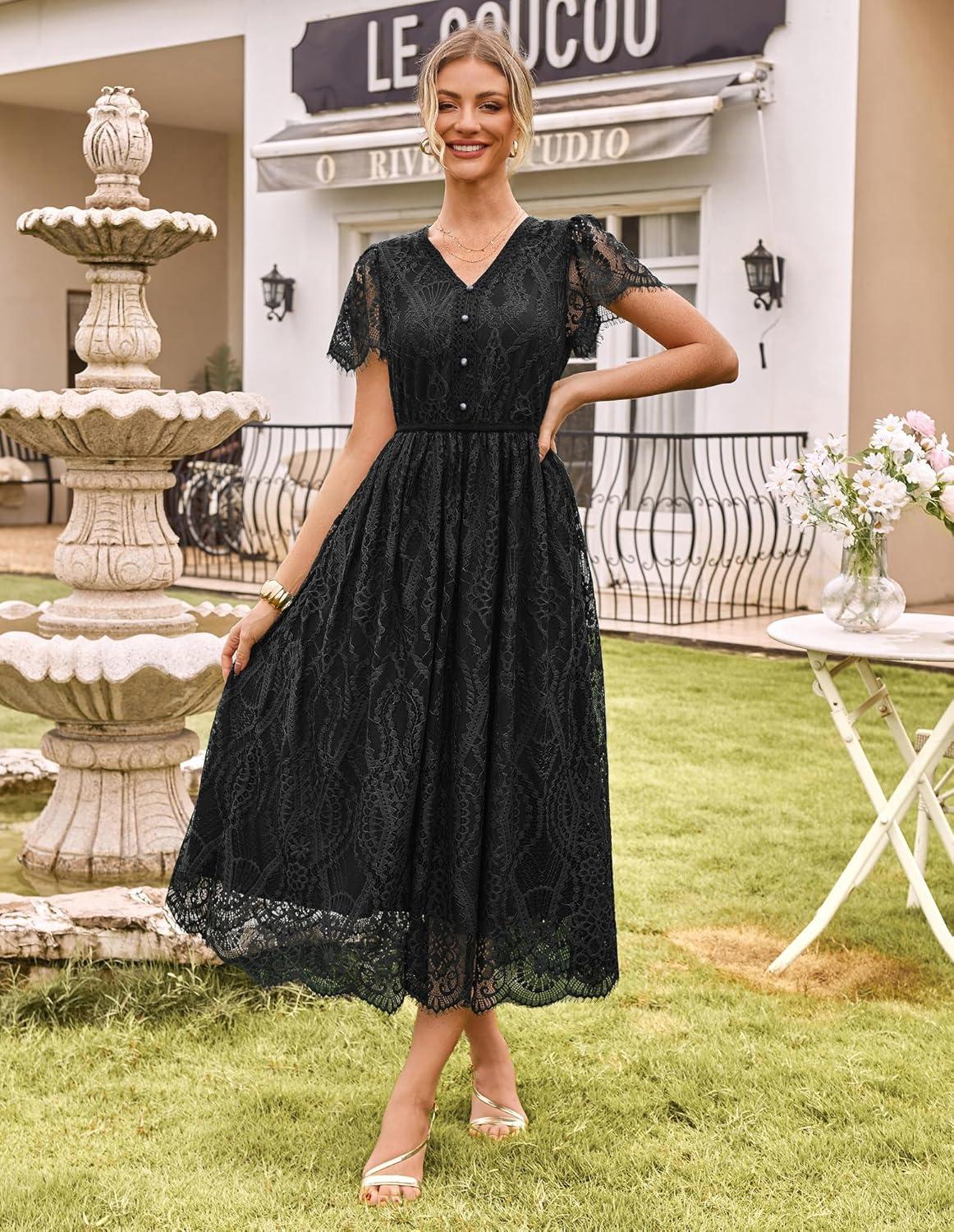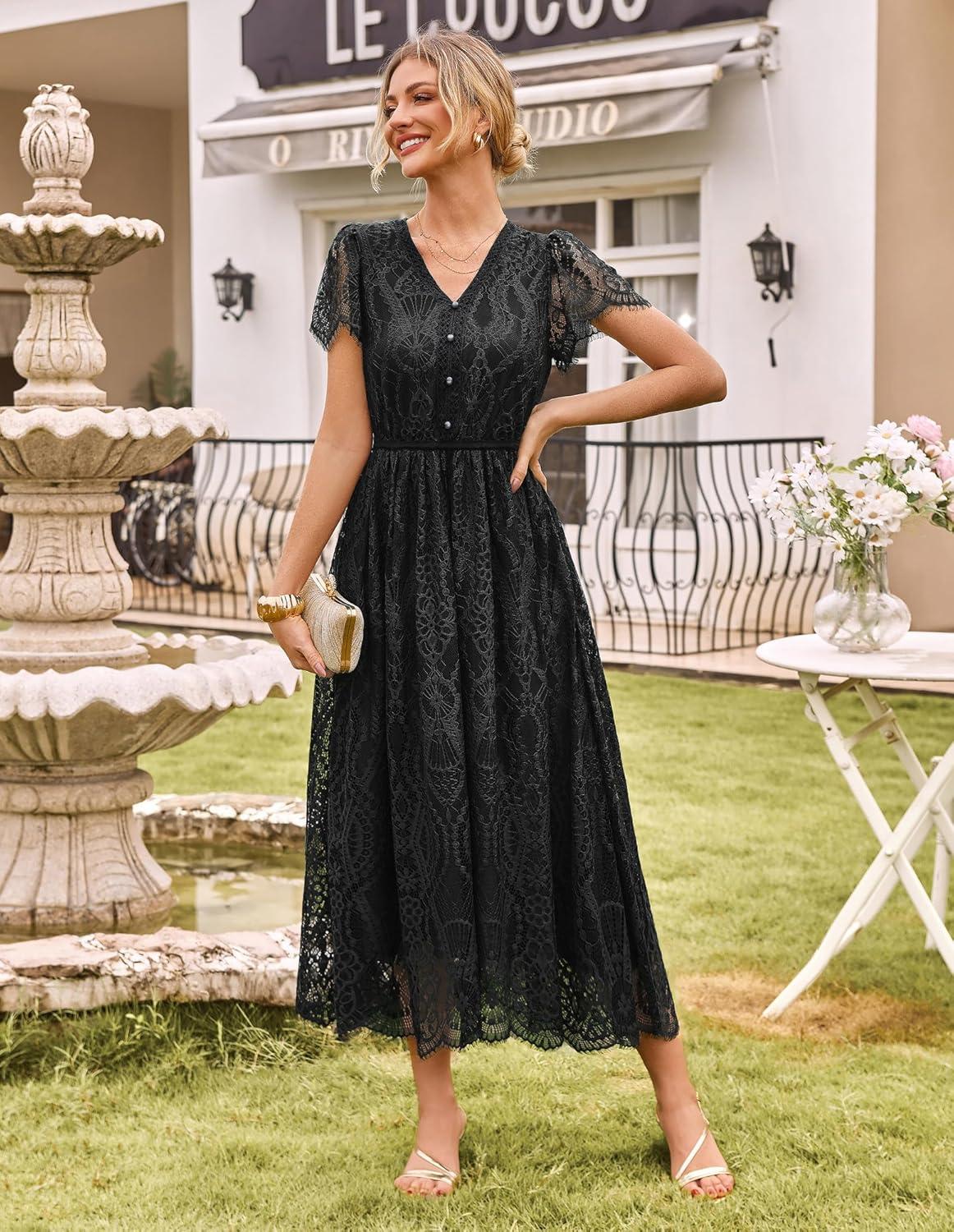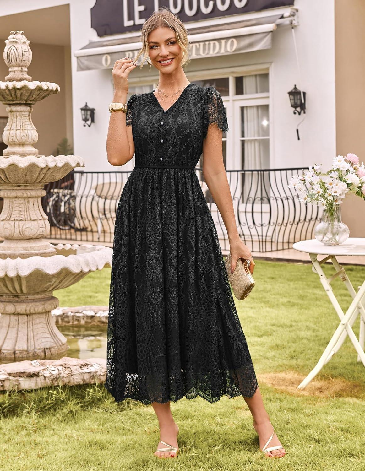 GRACE KARIN Women's V Neck Short Sleeve Buttons Floral Lace Wedding Dress Bridesmaid Cocktail Party Maxi Dress(Black)