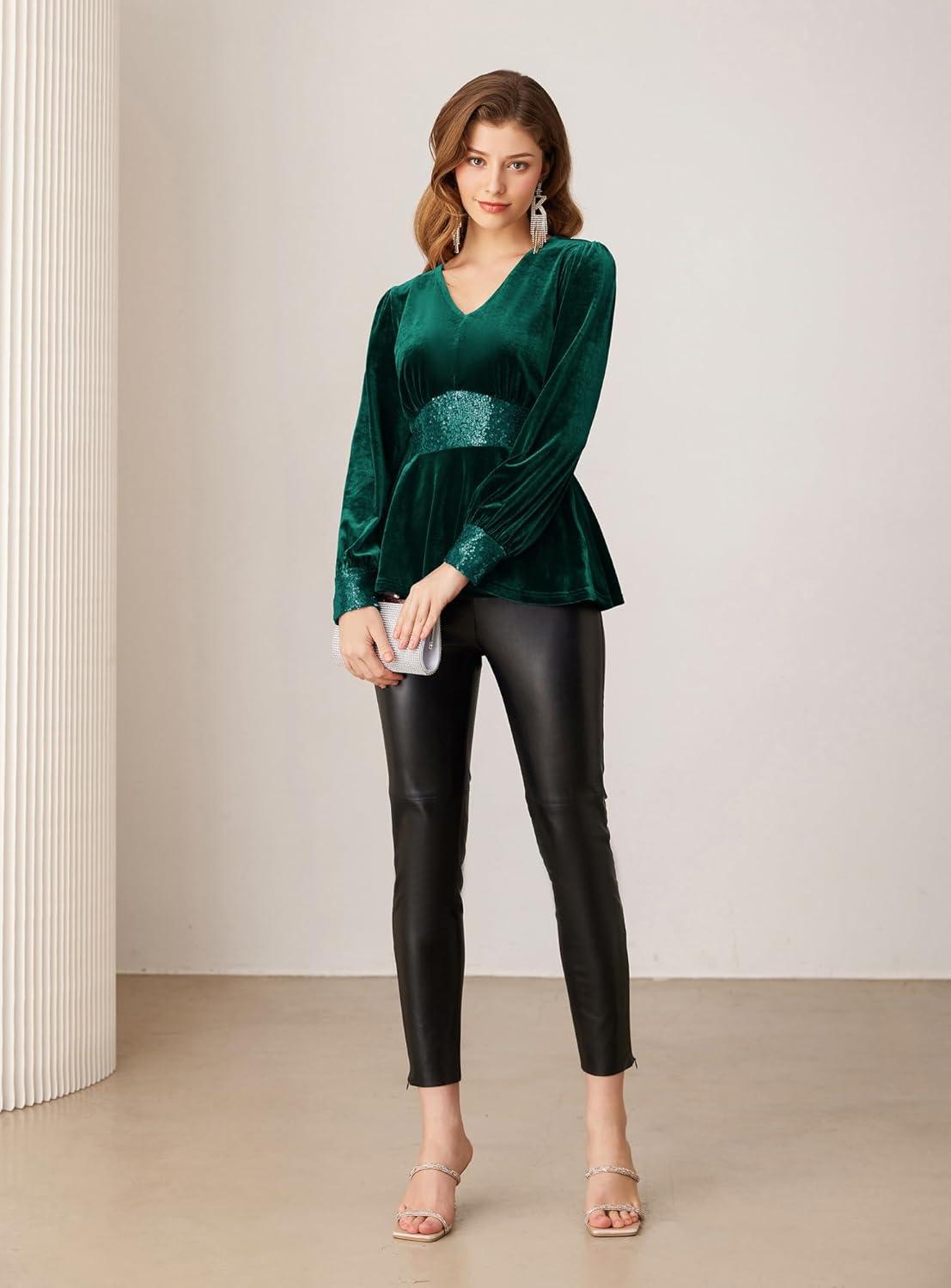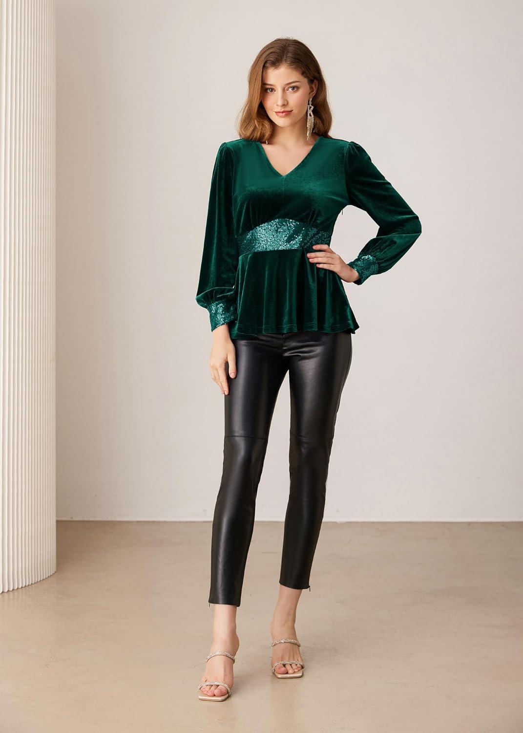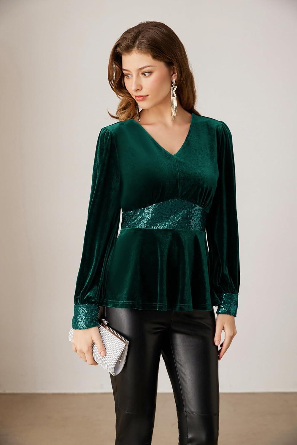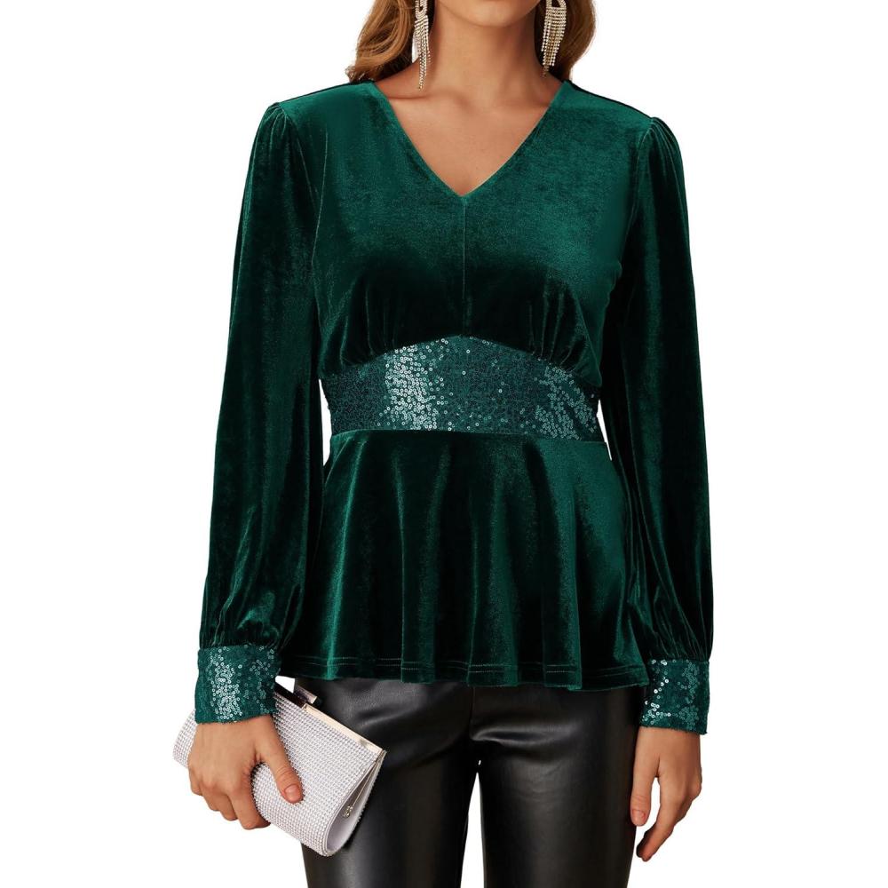 Get the GRACE KARIN Women’s V Neck Velvet Party Tops Long Sleeve Sparkly Sequin Peplum Cockatail Formal Fall Winter Blouse Tops(Green) you want at a discounted price during our markdown sale event.