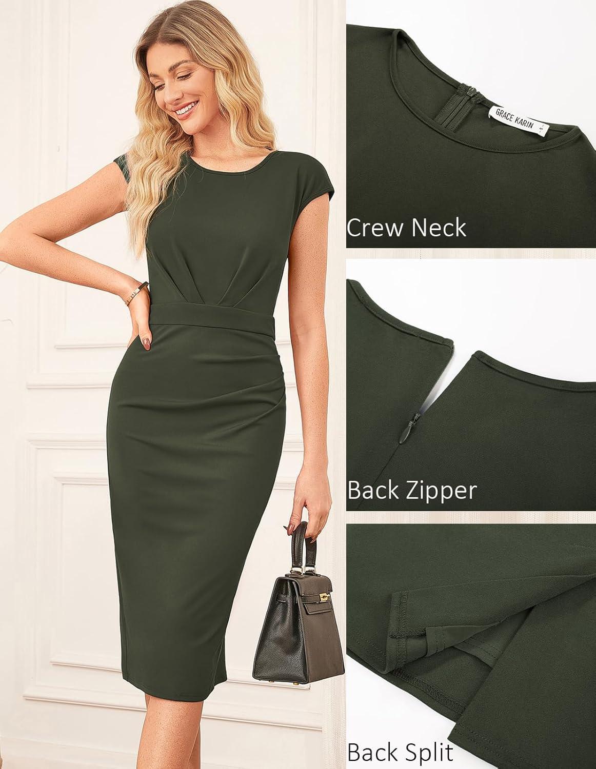 GRACE KARIN Women's Wear to Work Dresses 2025 Cap Sleeve Sheath Bodycon Midi Dress Ruched Business Office Pencil Dress(Army Green)