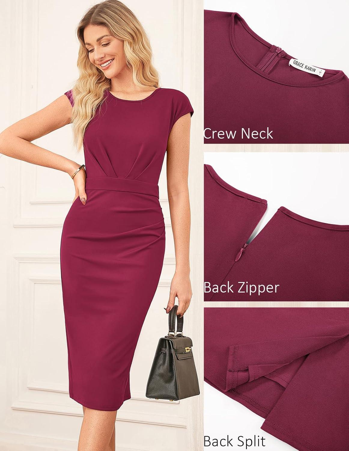 GRACE KARIN Women's Wear to Work Dresses 2025 Cap Sleeve Sheath Bodycon Midi Dress Ruched Business Office Pencil Dress(Wine Red)