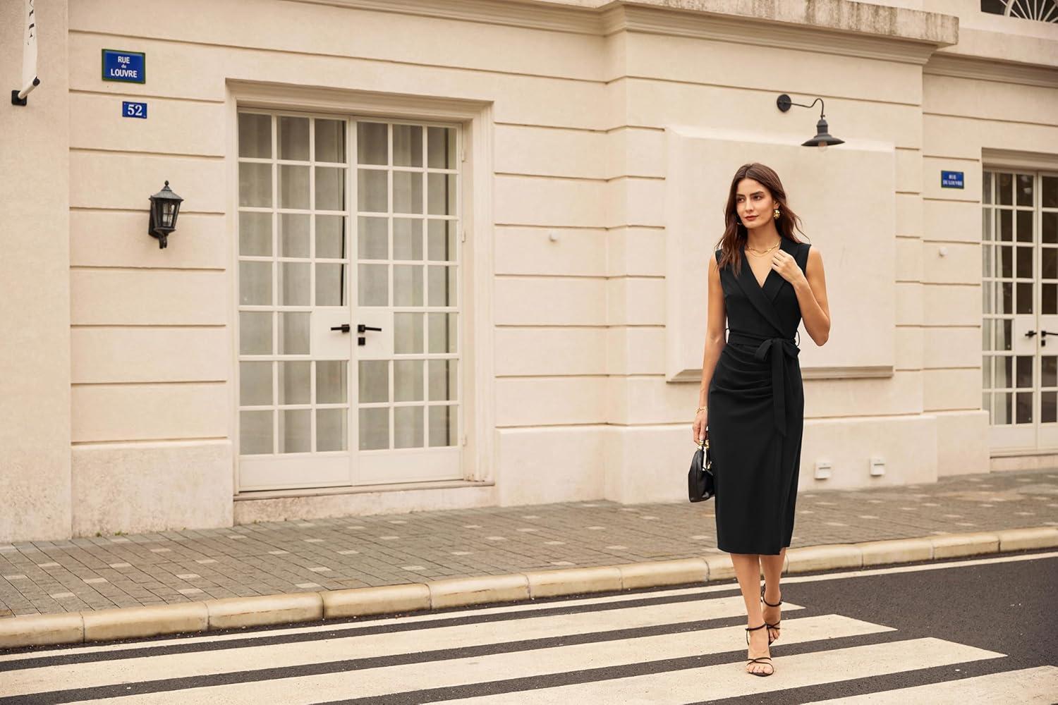 GRACE KARIN Women's Wear to Work Sleeveless Ruched Bodycon Office Pencil Midi Dresses with Belt(Black)