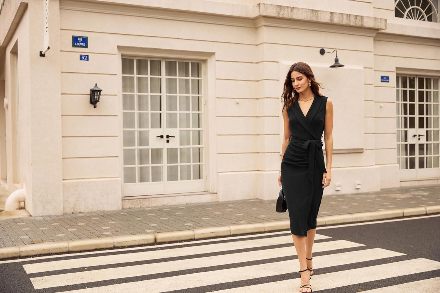 GRACE KARIN Women’s Wear to Work Sleeveless Ruched Bodycon Office Pencil Midi Dresses with Belt(Black)
