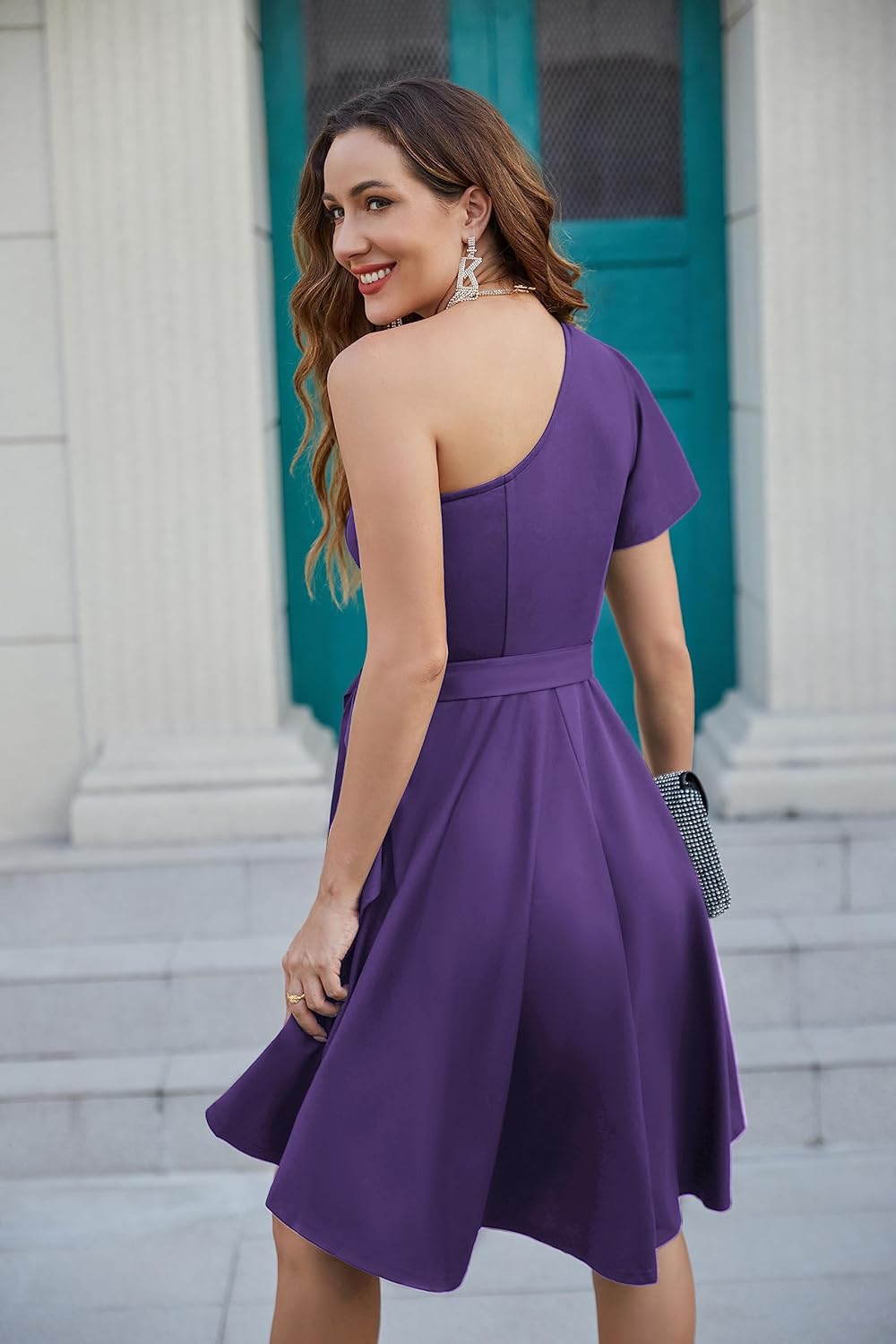 GRACE KARIN Womens Wedding Guest Dress Elegant One Shoulder Cocktail Skater Dress Ruffle Short Sleeve A Line Party DressesDark Purple