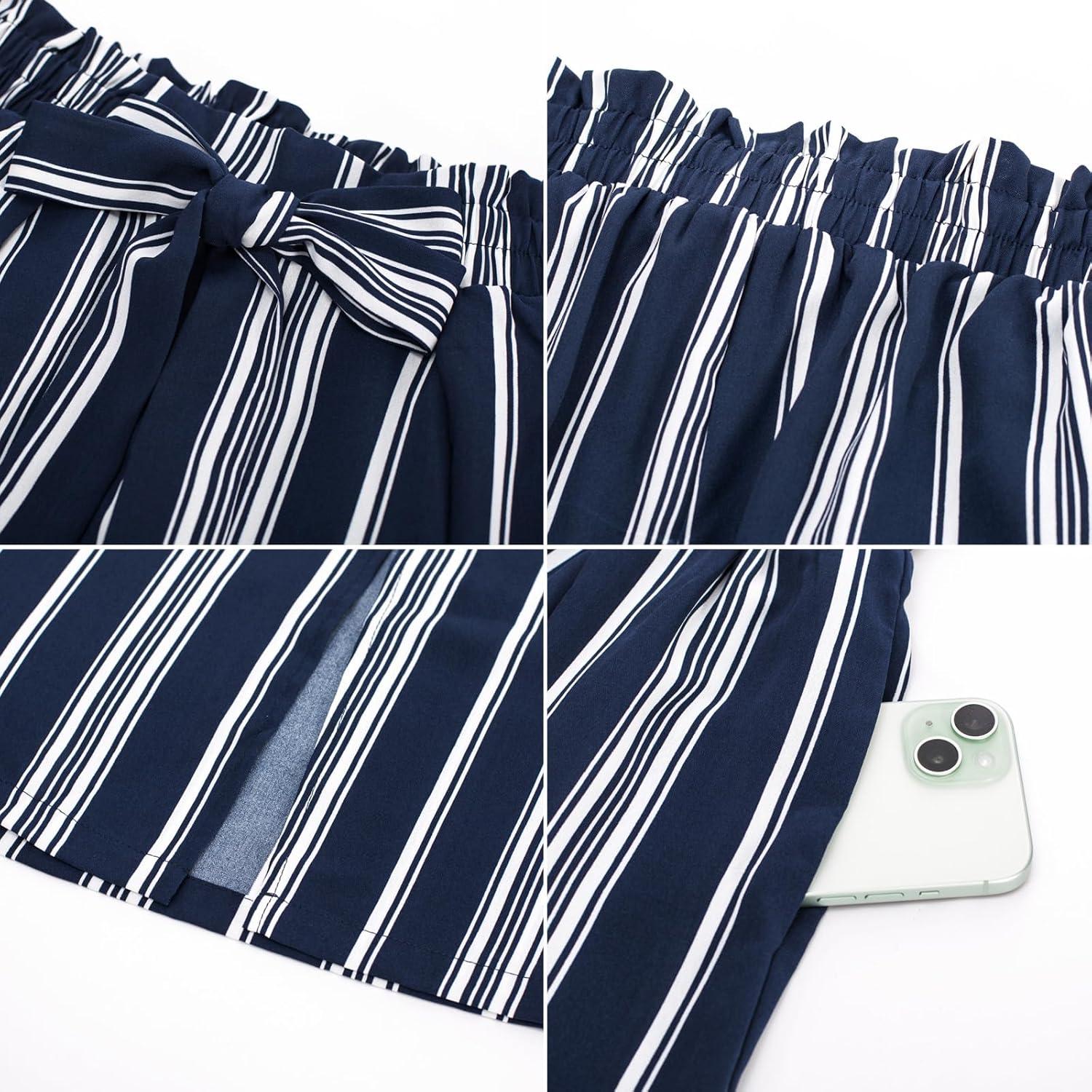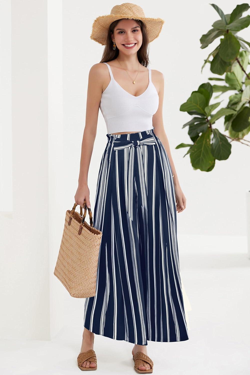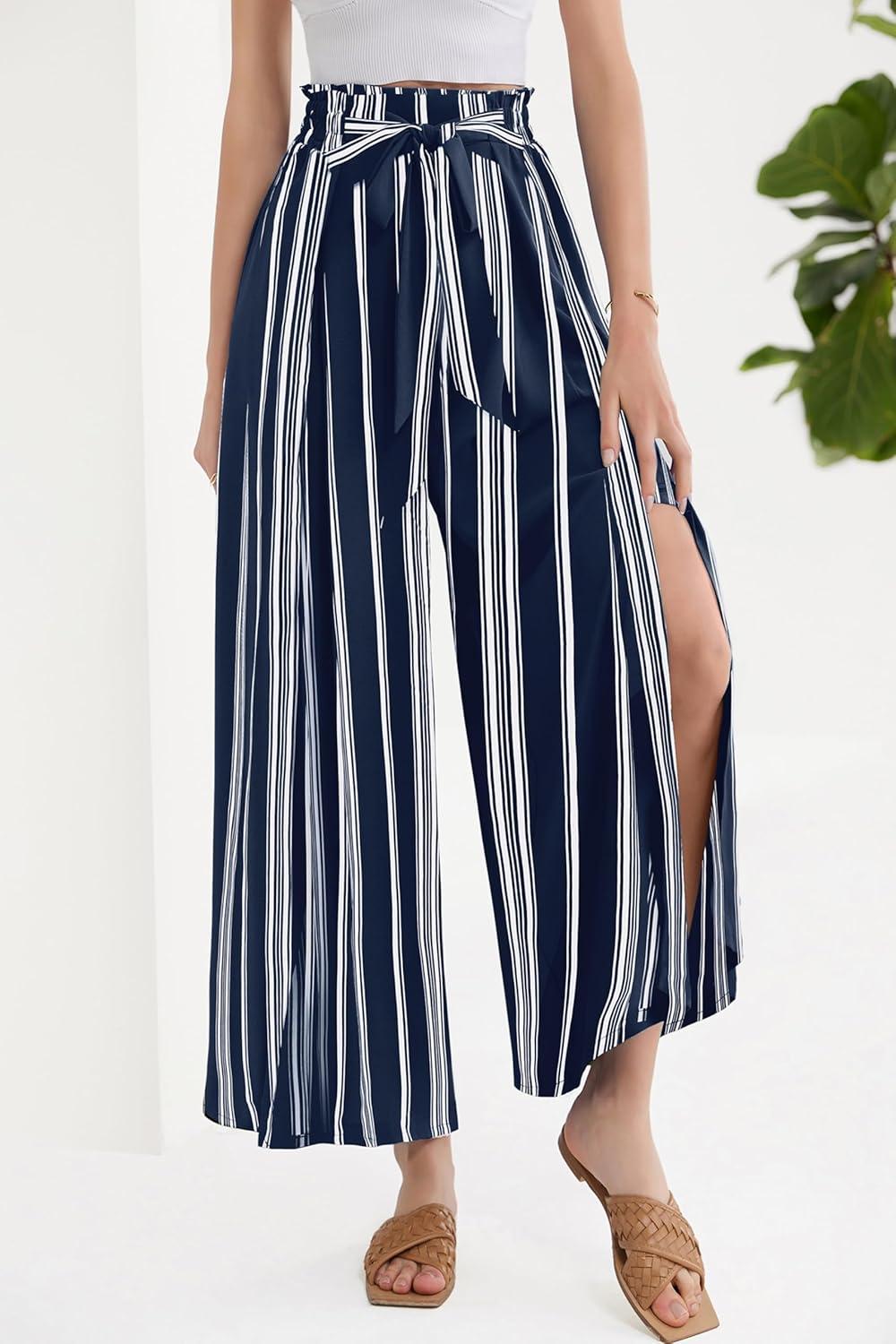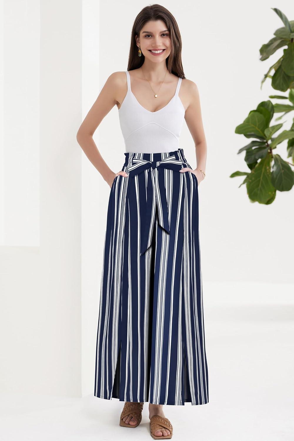 GRACE KARIN Women's Wide Leg Pants with Pockets Lightweight High Waisted Tie Knot Caual Loose Split Flowy Palazzo Trousers(Stripe Navy)
