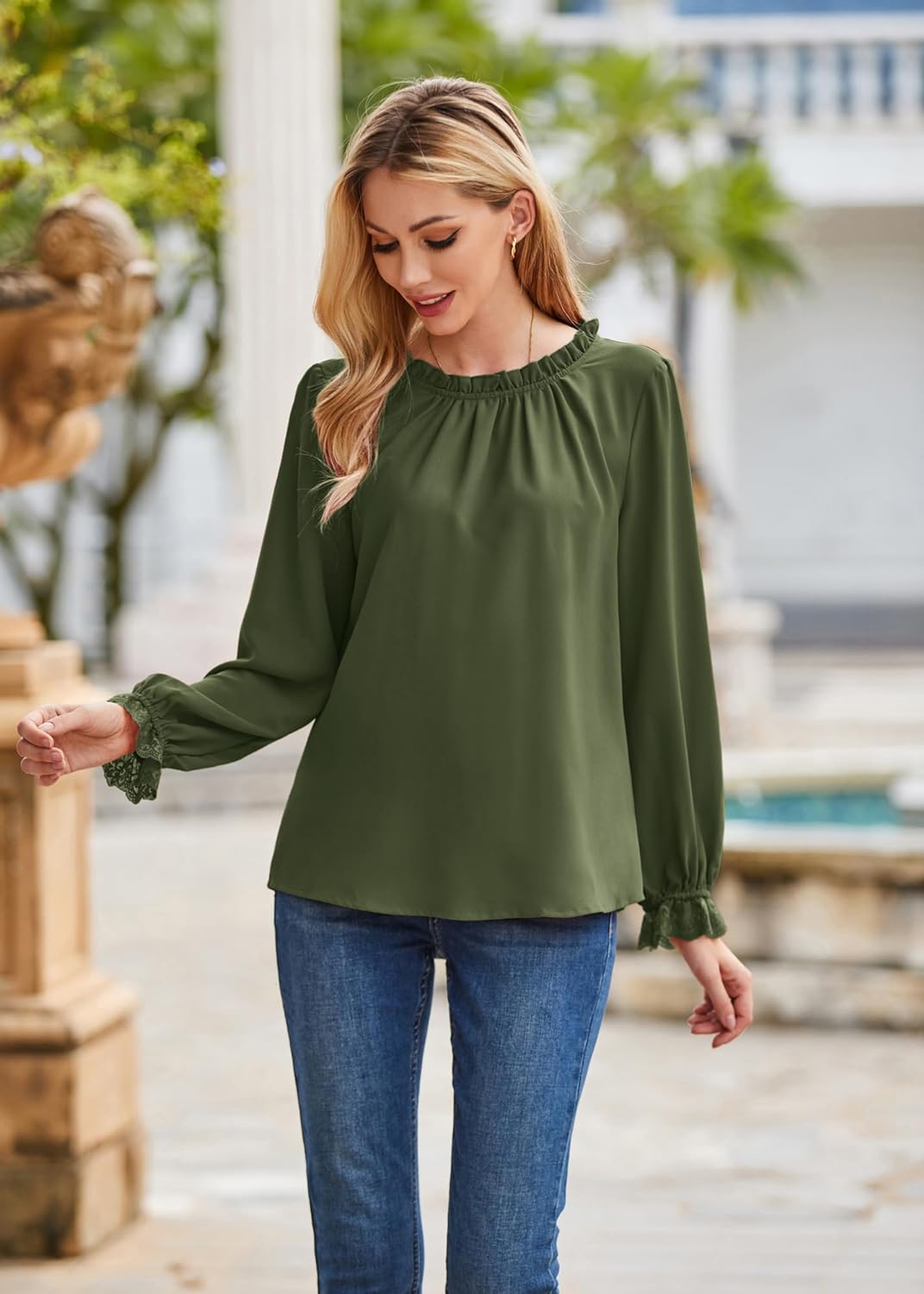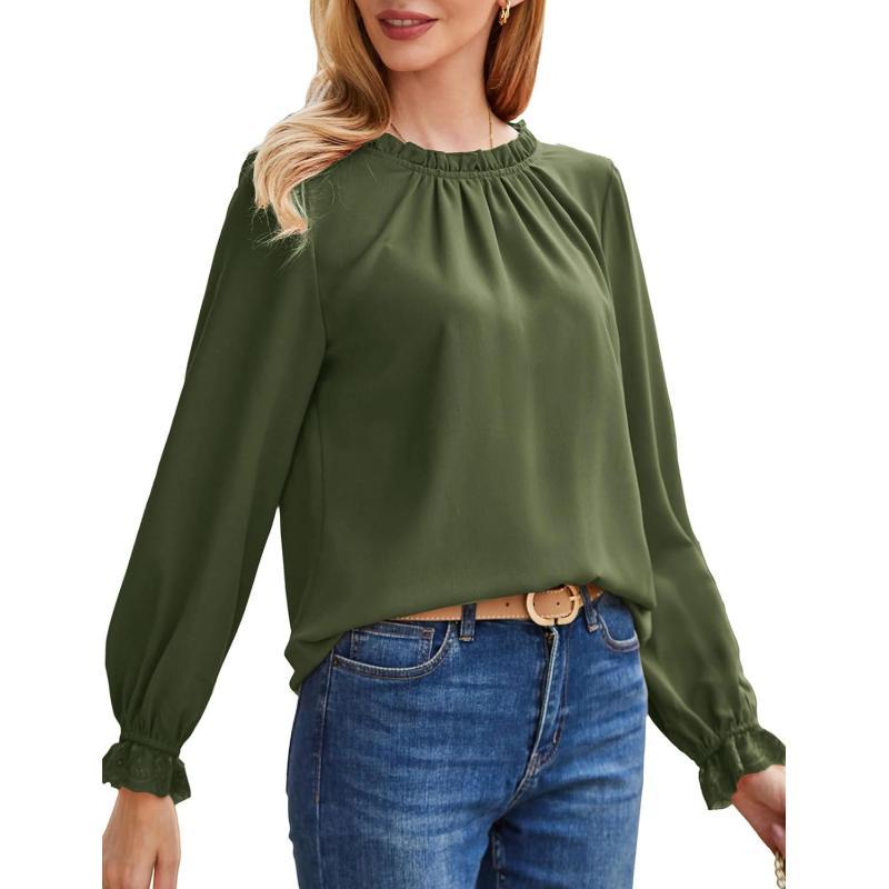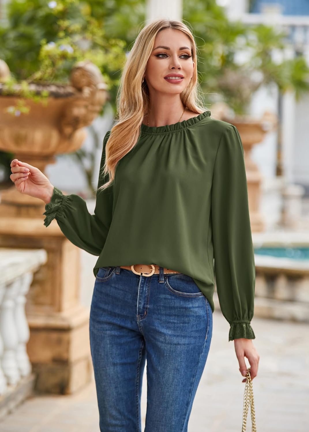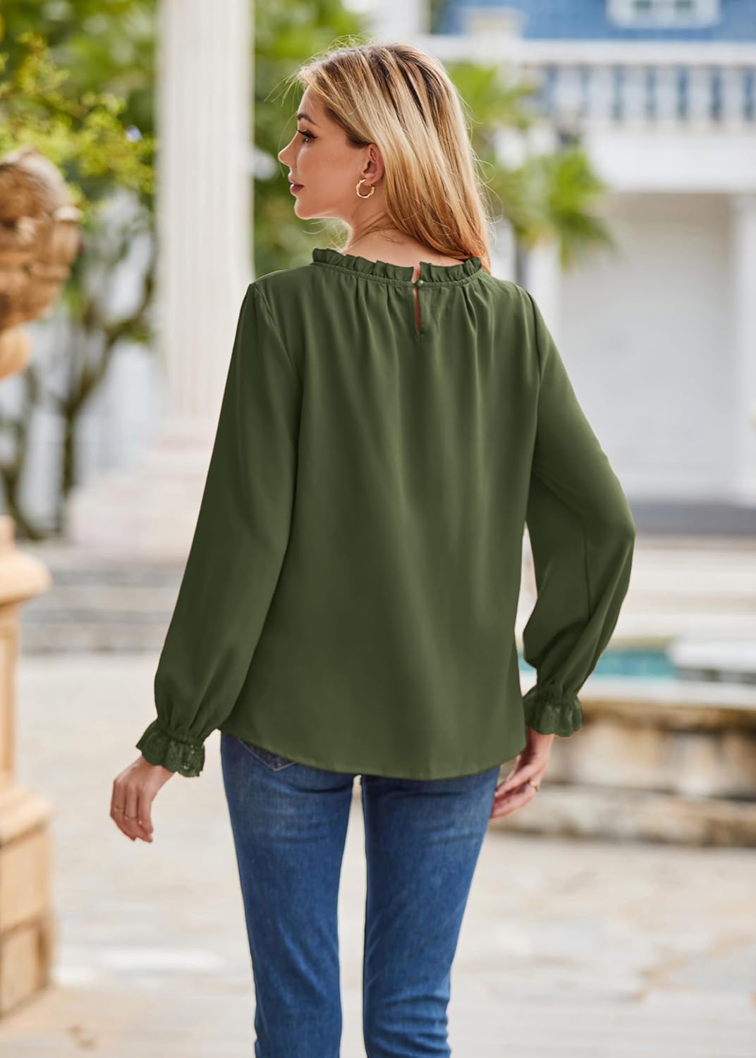 GRACE KARIN Women’s Work Blouses Dressy Casual Tank Tops Long Sleeve Dress Shirts Frill Collar Business Professional(Army Green-long Sleeve)