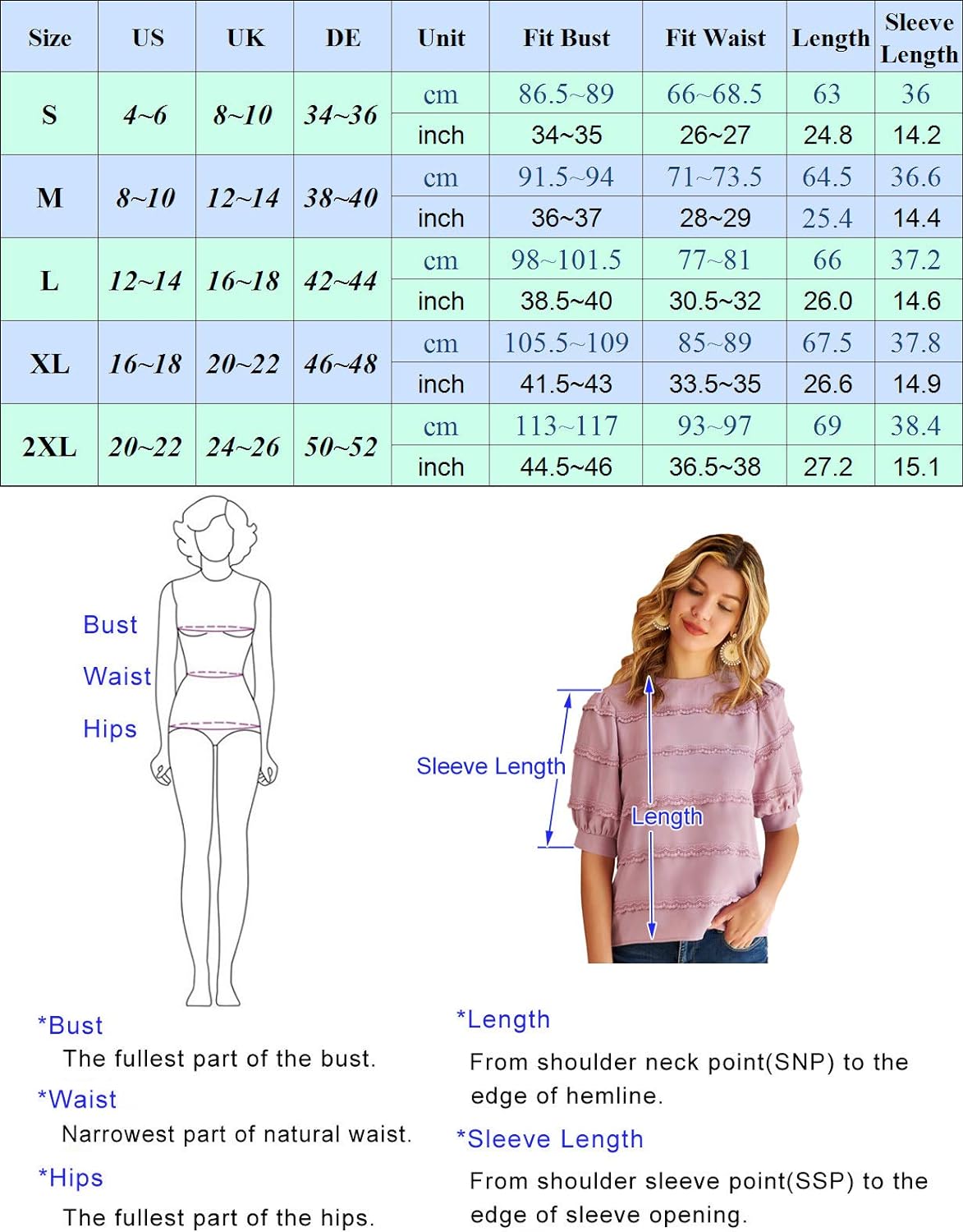 【FEATURE】Round neck, elastic bud shape puff sleeve, Lace floral layered trim, keyhole, plain, pullover. Lace Trim design creates a more fashion and trendy look, unique from others.