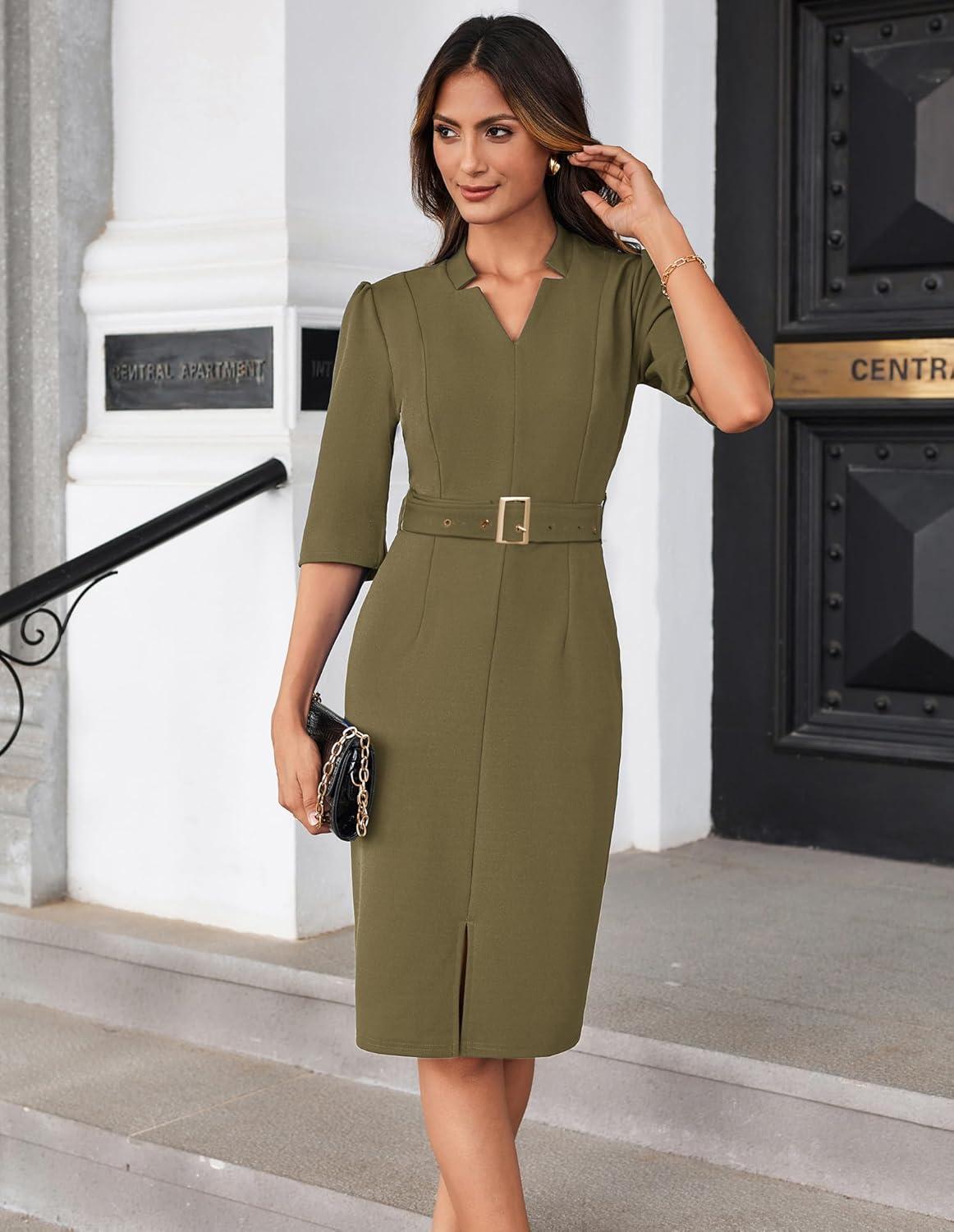 imageGRACE KARIN Womens Work Dress 34 Sleeve V Neck Bodycon Sheath Dress Zipper Up Office Business Dresses with BeltGreen