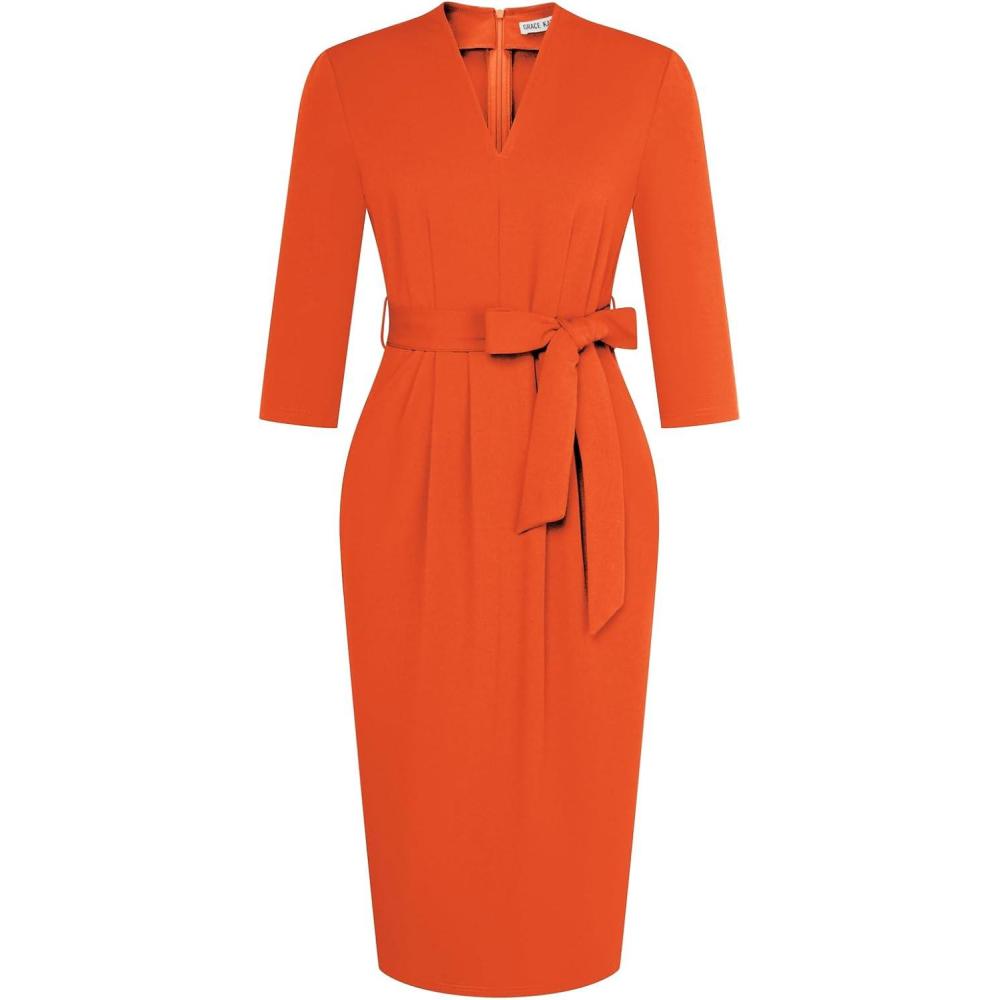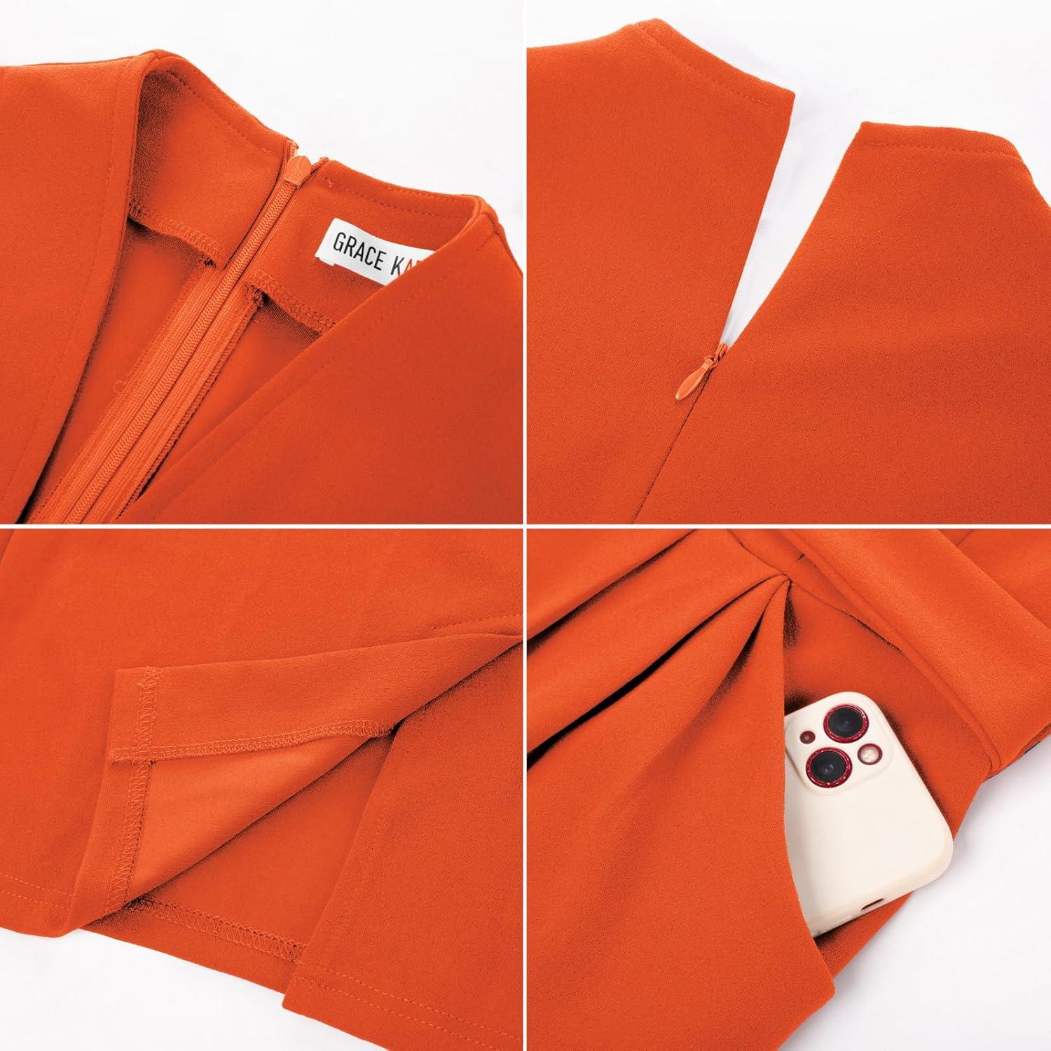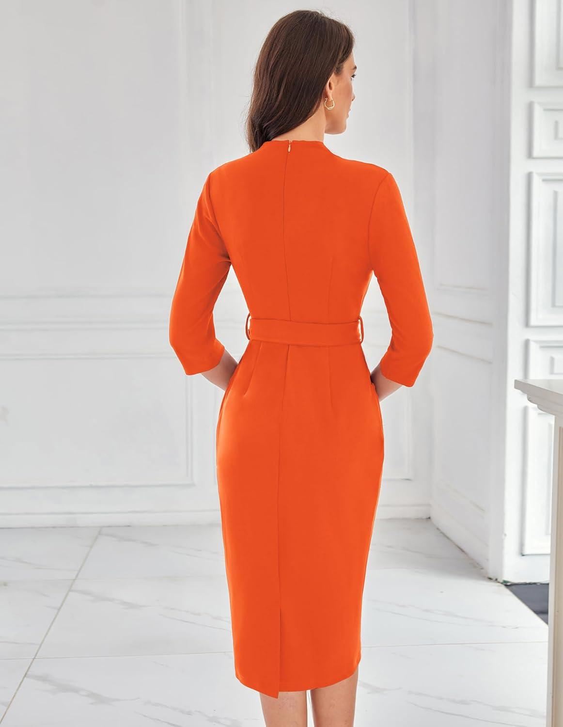 GRACE KARIN Womens Work Dresses V Neck 3/4 Sleeve Back Zipper Tie Waist Bodycon Dress Office Cocktail Dress with Pockets(Orange)