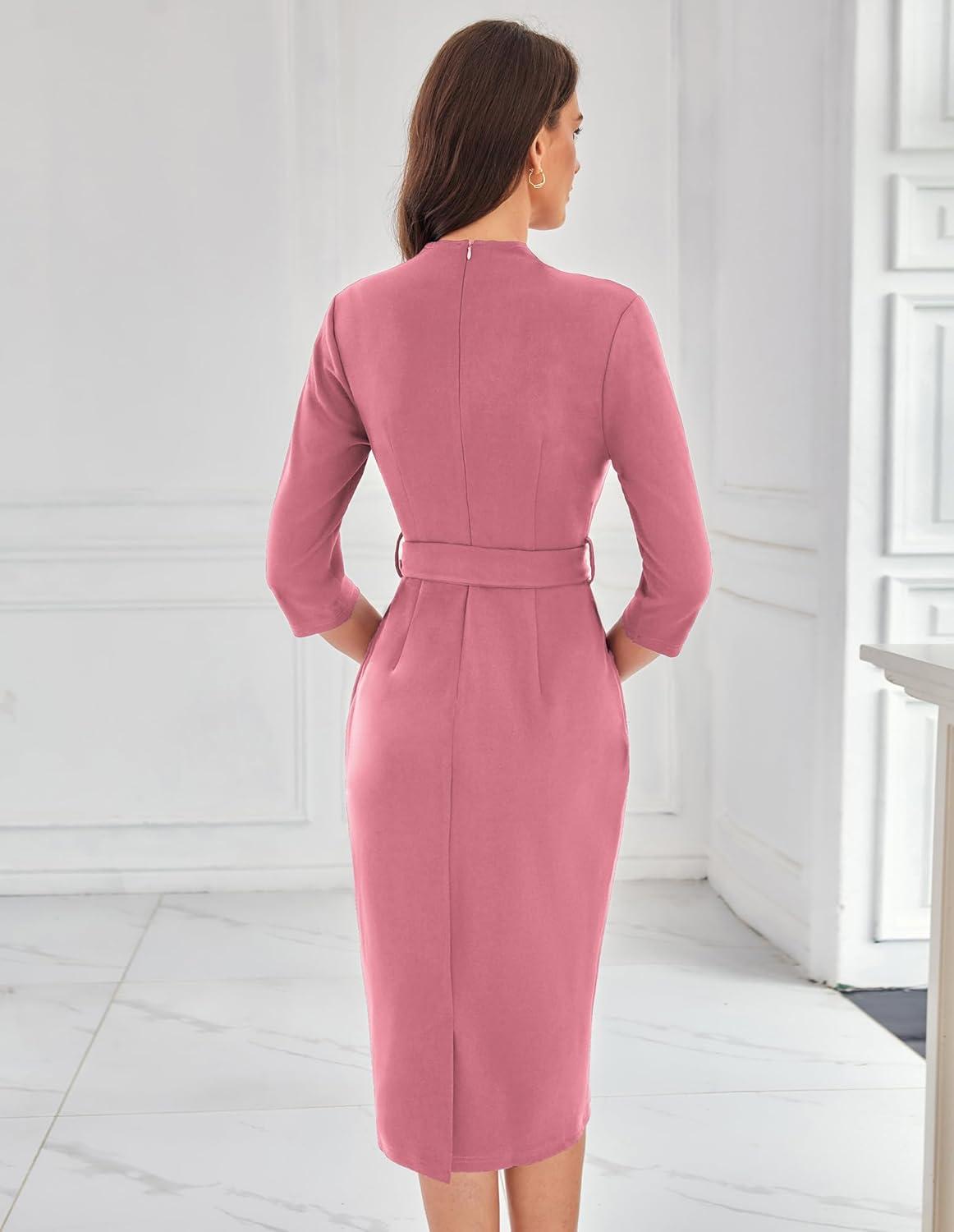 GRACE KARIN Womens Work Dresses V Neck 3/4 Sleeve Back Zipper Tie Waist Bodycon Dress Office Cocktail Dress with Pockets(Pink)