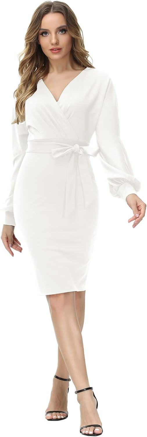 GRACE KARIN Women’s Work Pencil Dress Wedding Guest Office Dresses Cocktail Party Long Sleeve(White(solid Color, Long Sleeve))