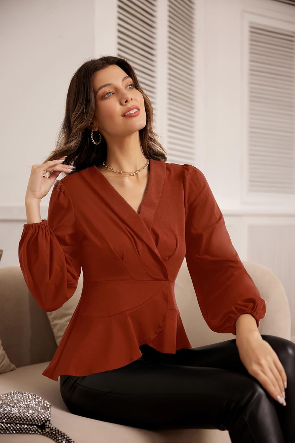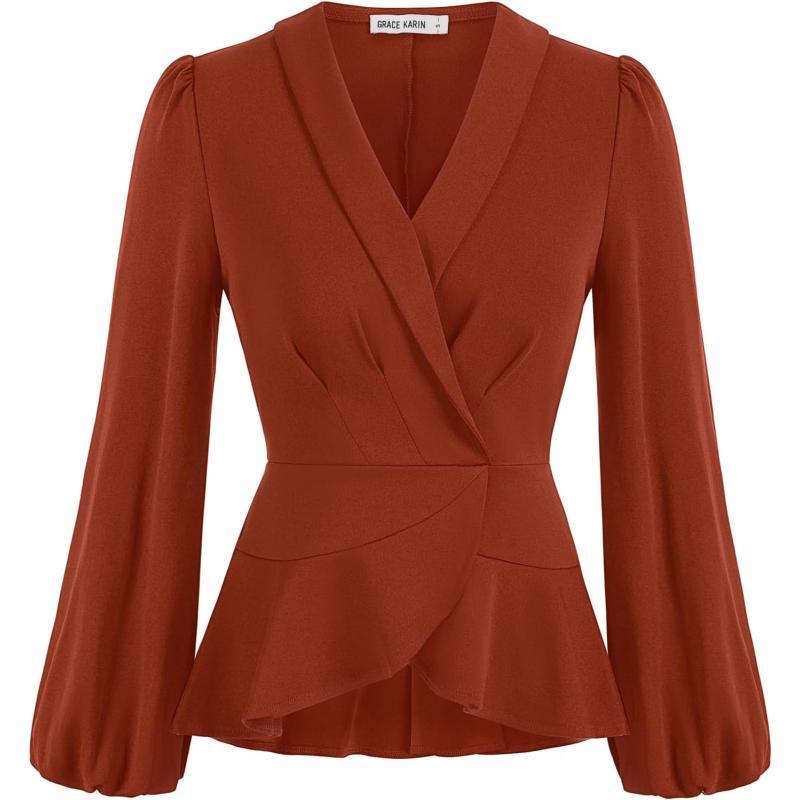 GRACE KARIN Womens Wrap Tops Elegant V Neck Long Lantern Sleeve Work Formal Top Dressy ShirtsBrown