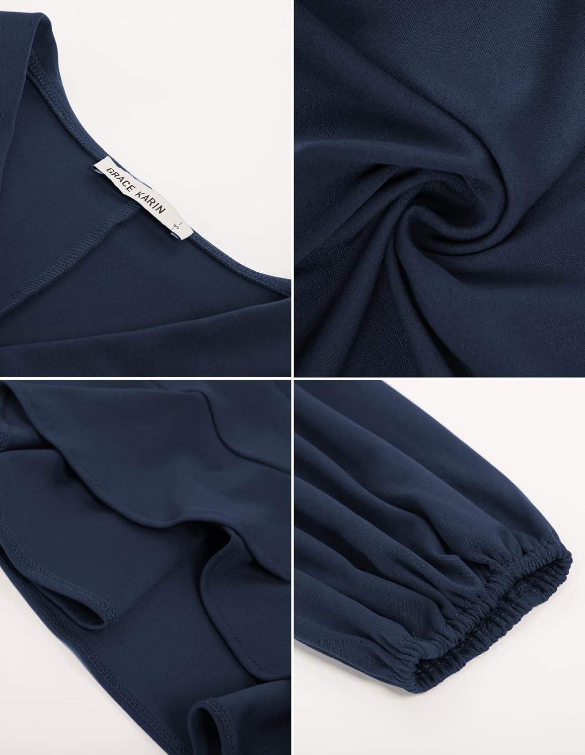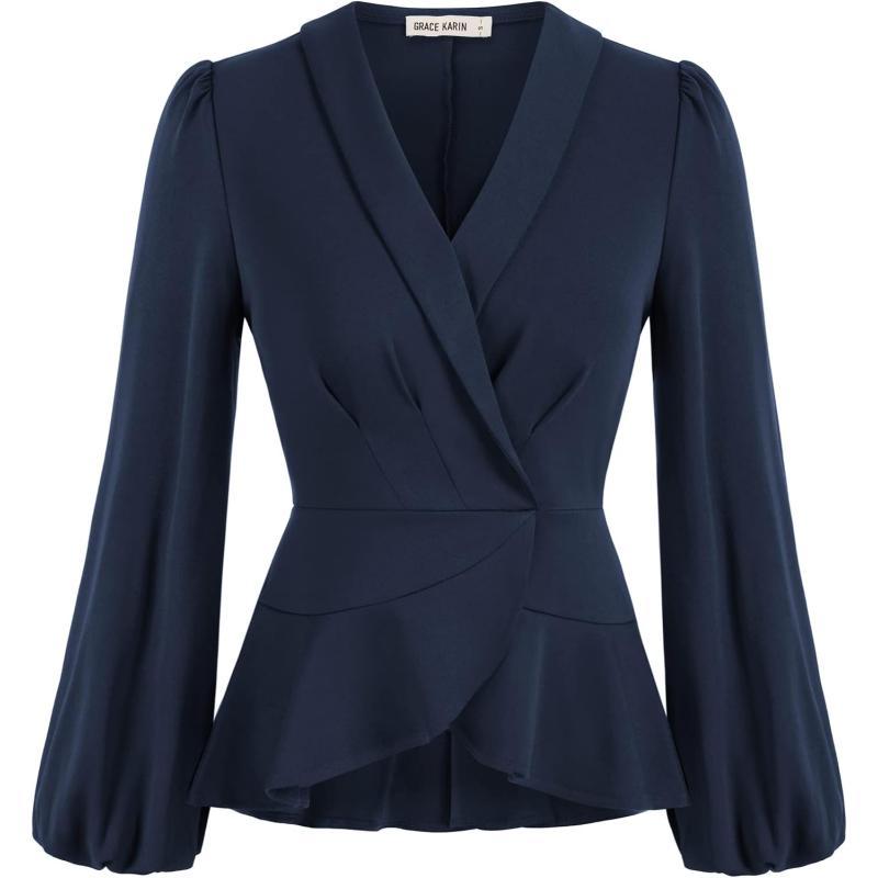 GRACE KARIN Womens Wrap Tops Elegant V Neck Long Lantern Sleeve Work Formal Top Dressy ShirtsNavy Blue
