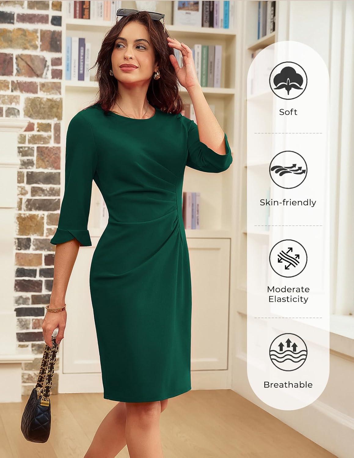 GRACE KARIN Work Dresses for Women 2025 3/4 Sleeve Sheath Business Dress Ruched Bodycon Office Cocktail Dress(Dark Green)