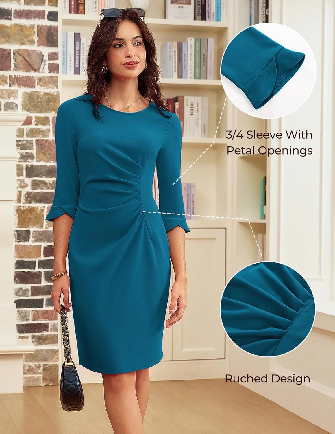 imageGRACE KARIN Work Dresses for Women 2025 34 Sleeve Sheath Business Dress Ruched Bodycon Office Cocktail DressPeacock Blue