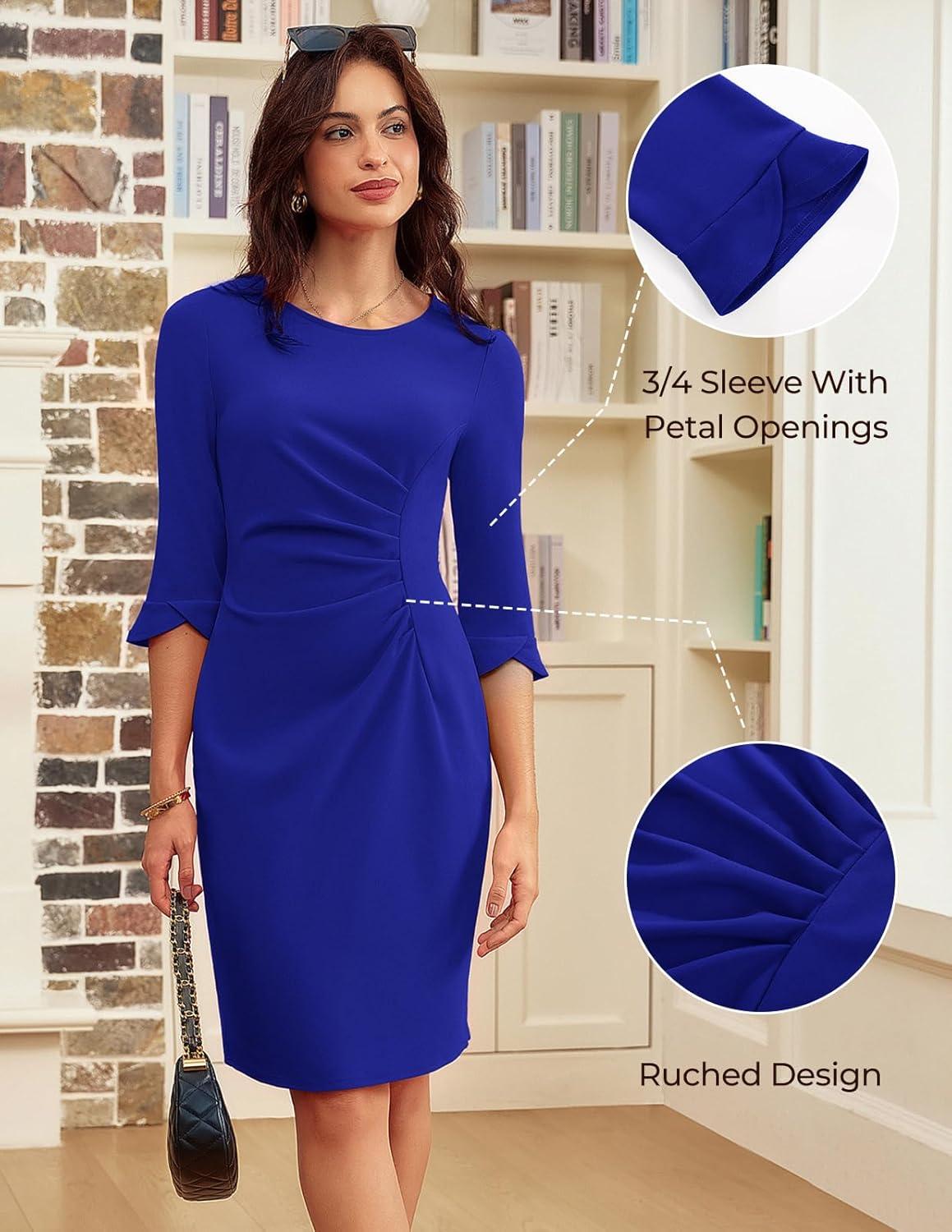 GRACE KARIN Work Dresses for Women 2025 3/4 Sleeve Sheath Business Dress Ruched Bodycon Office Cocktail Dress(Royal Blue)
