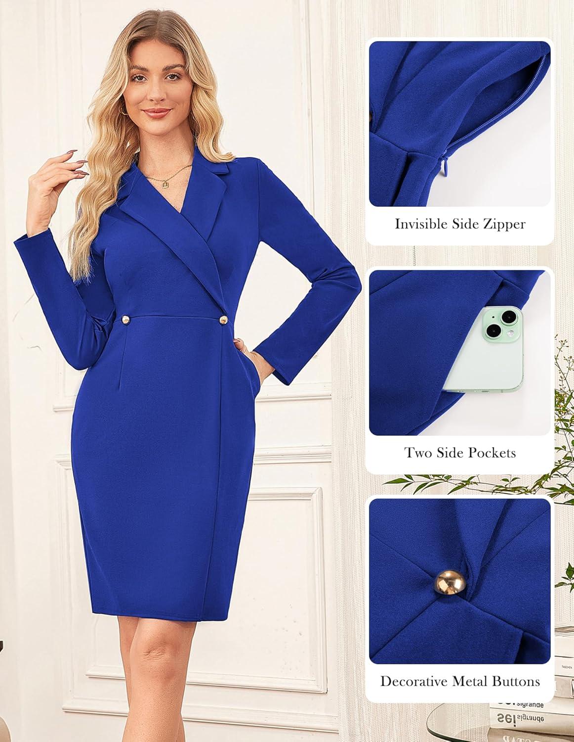 GRACE KARIN Work Dresses for Women 2025 Long Sleeve Business Dress Elegant Wrap Church Office Sheath Dress with Pockets(Royal Blue)