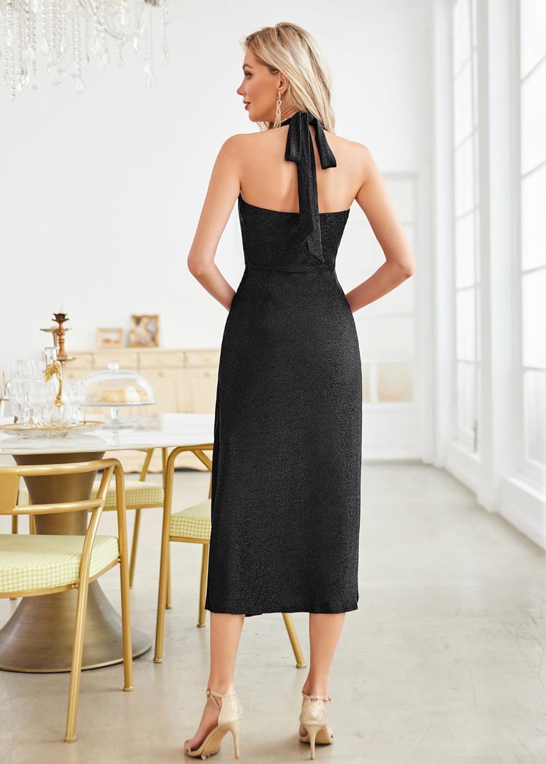 Women Formal Wedding Guest Dresses Lurex Halter Cowl Neck Wrap Cocktail Dresses for Evening Prom Party(Black)