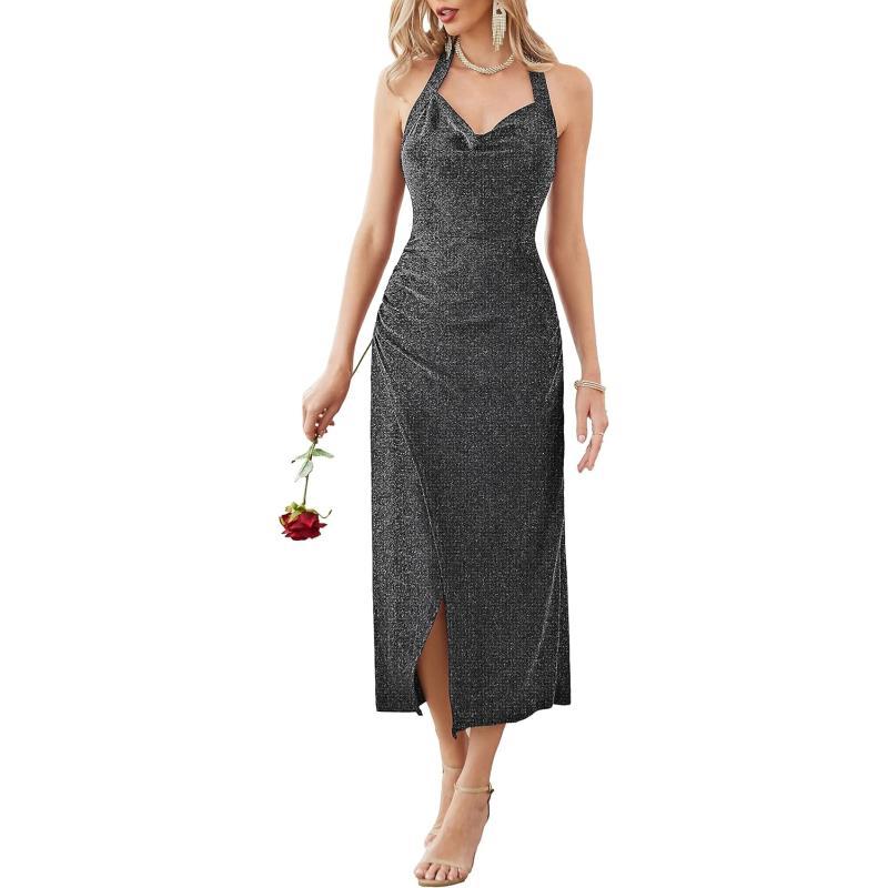 Women Formal Wedding Guest Dresses Lurex Halter Cowl Neck Wrap Cocktail Dresses for Evening Prom PartyBlack