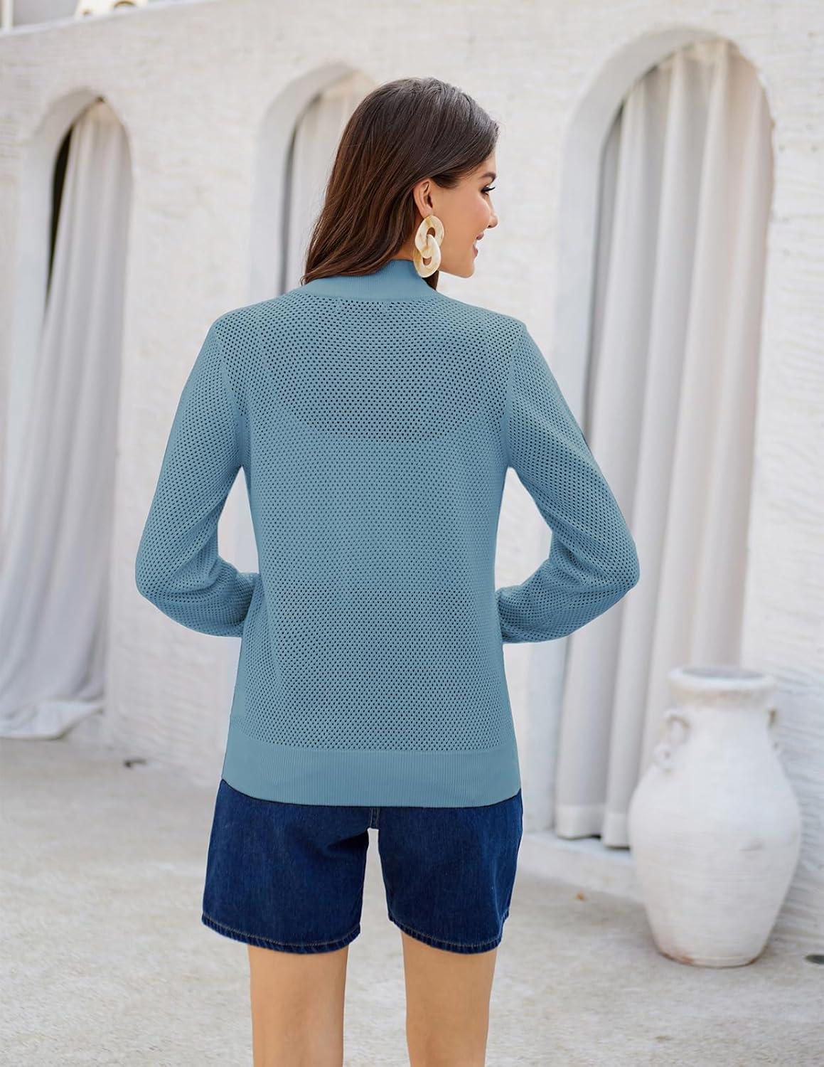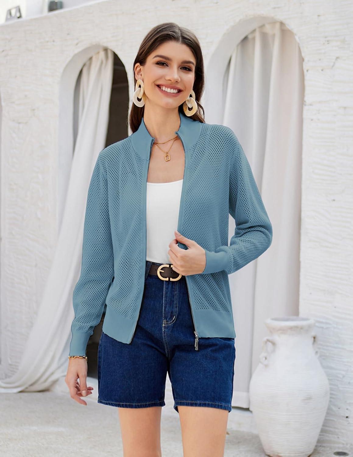 Women’s 2024 Summer Mesh Cardigan Lightweight Long Sleeve Zip Up Crochet Knit Sweater Jacket Athleisure Outfits(Light Blue)