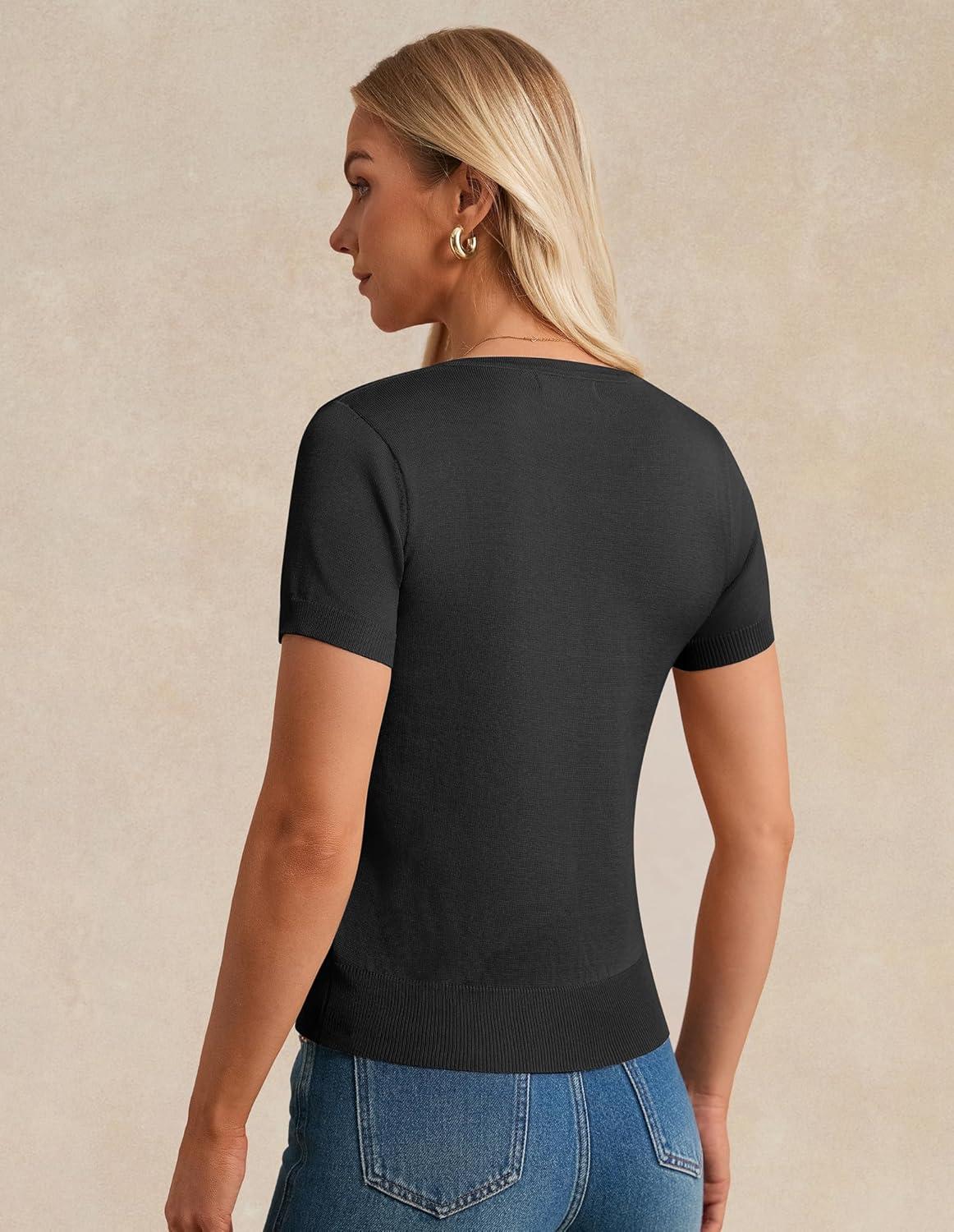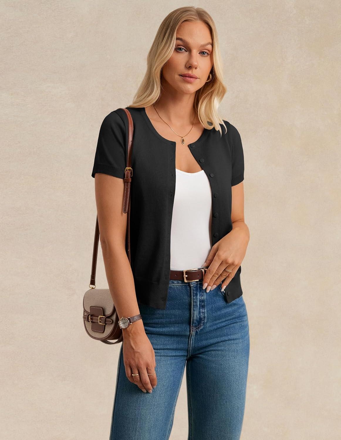 imageWomens Short Sleeve Cardigan Crew Neck Basic Casual Button Down Knit Soft SweaterBlack