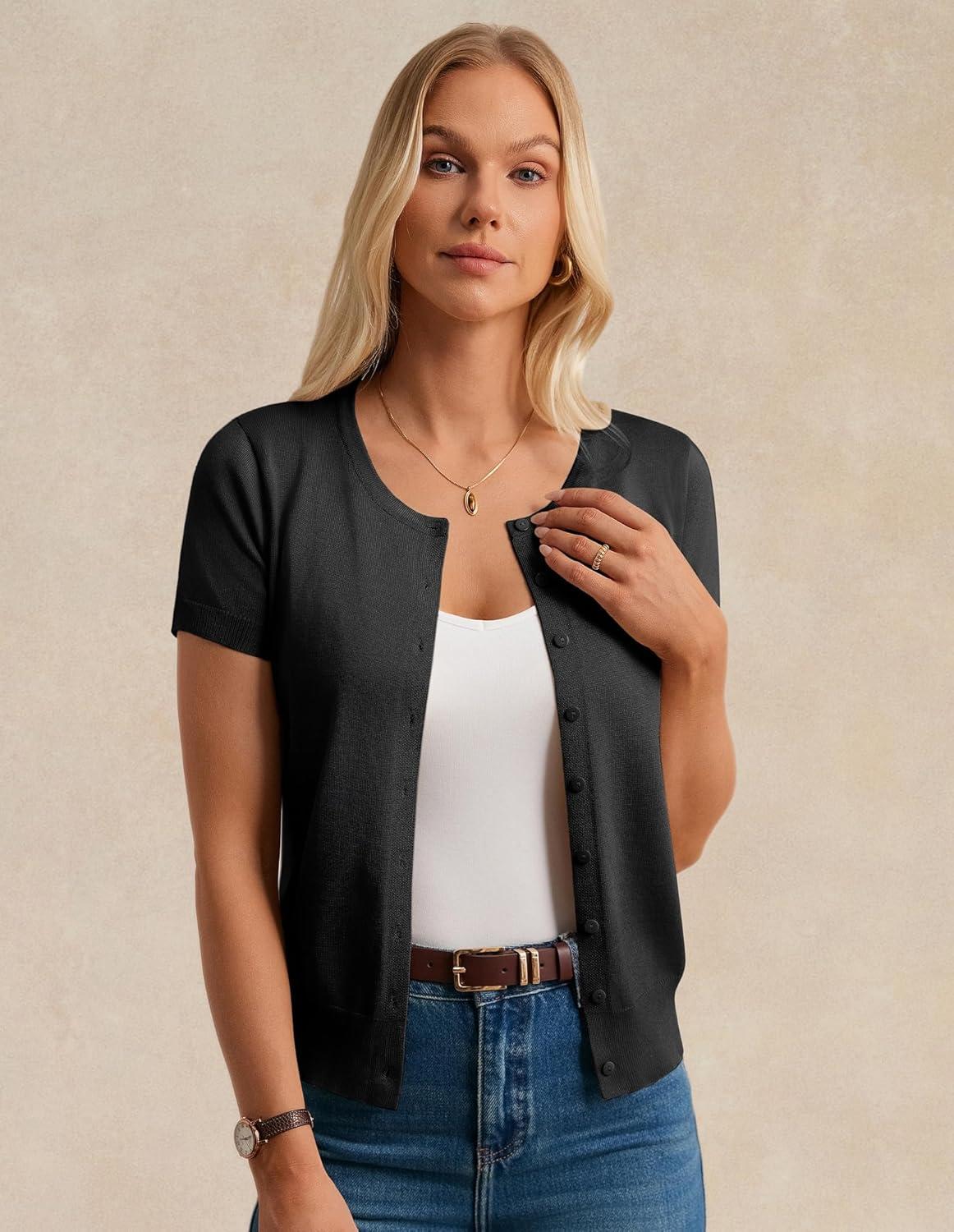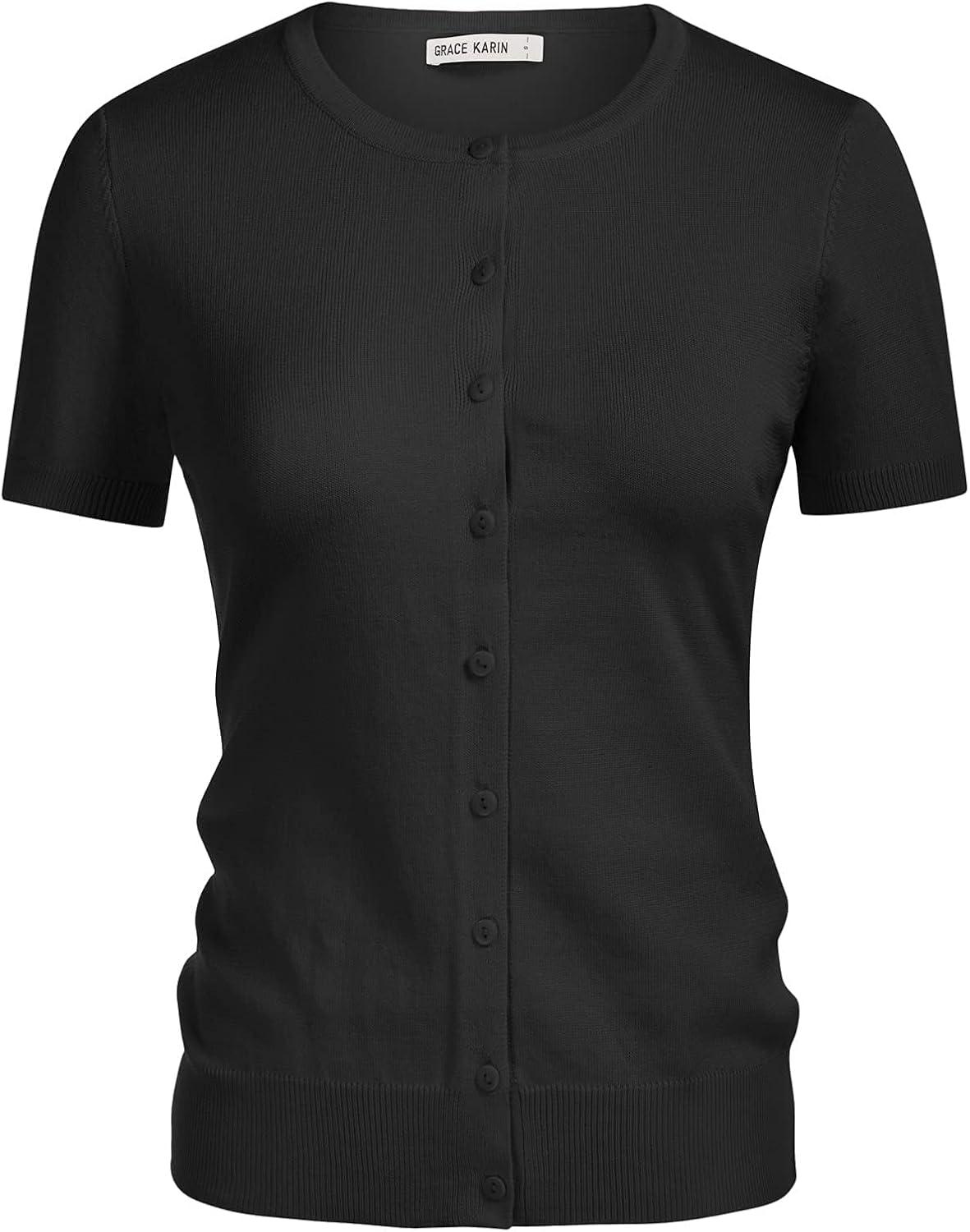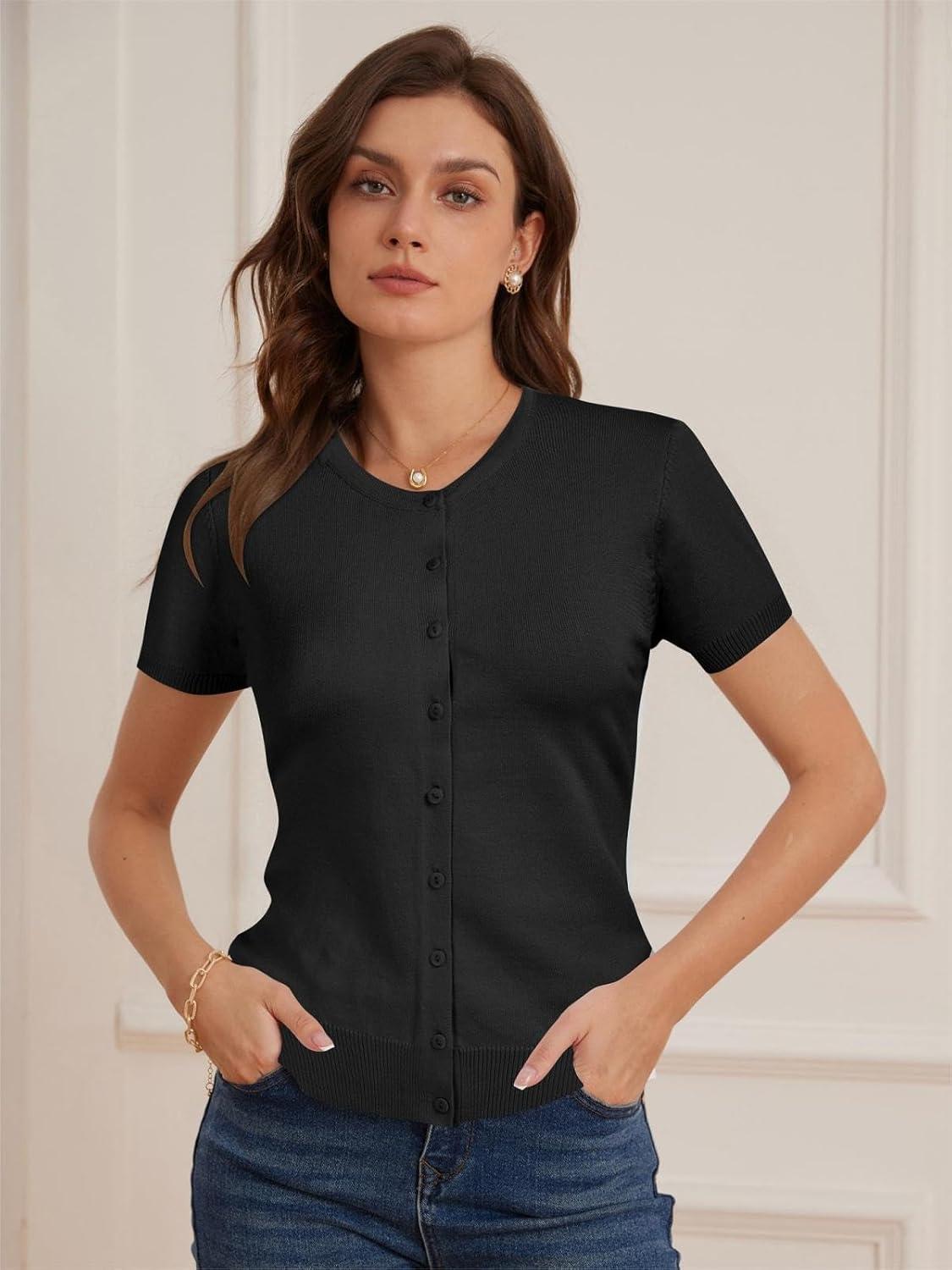 Womens Short Sleeve Cardigan Crew Neck Basic Casual Button Down Knit Soft Sweater(Black)