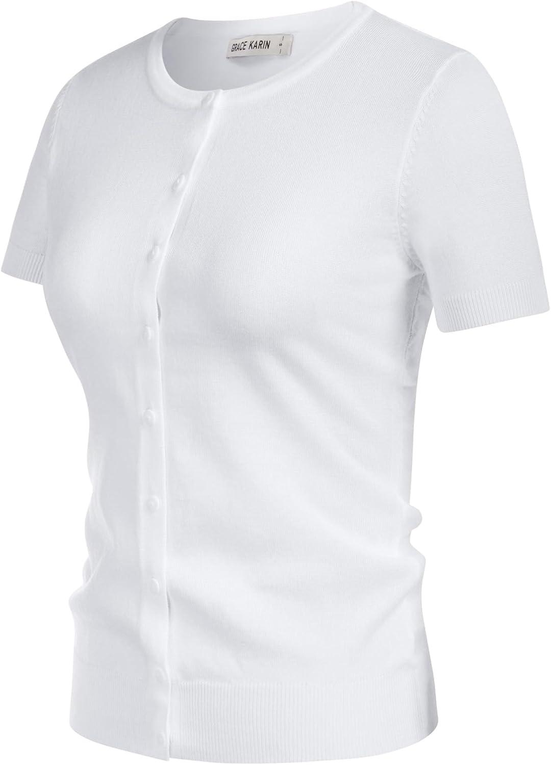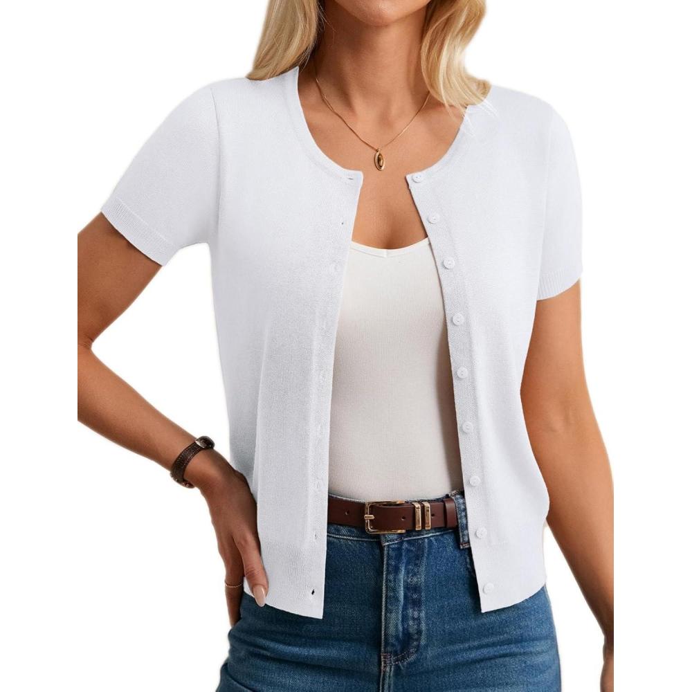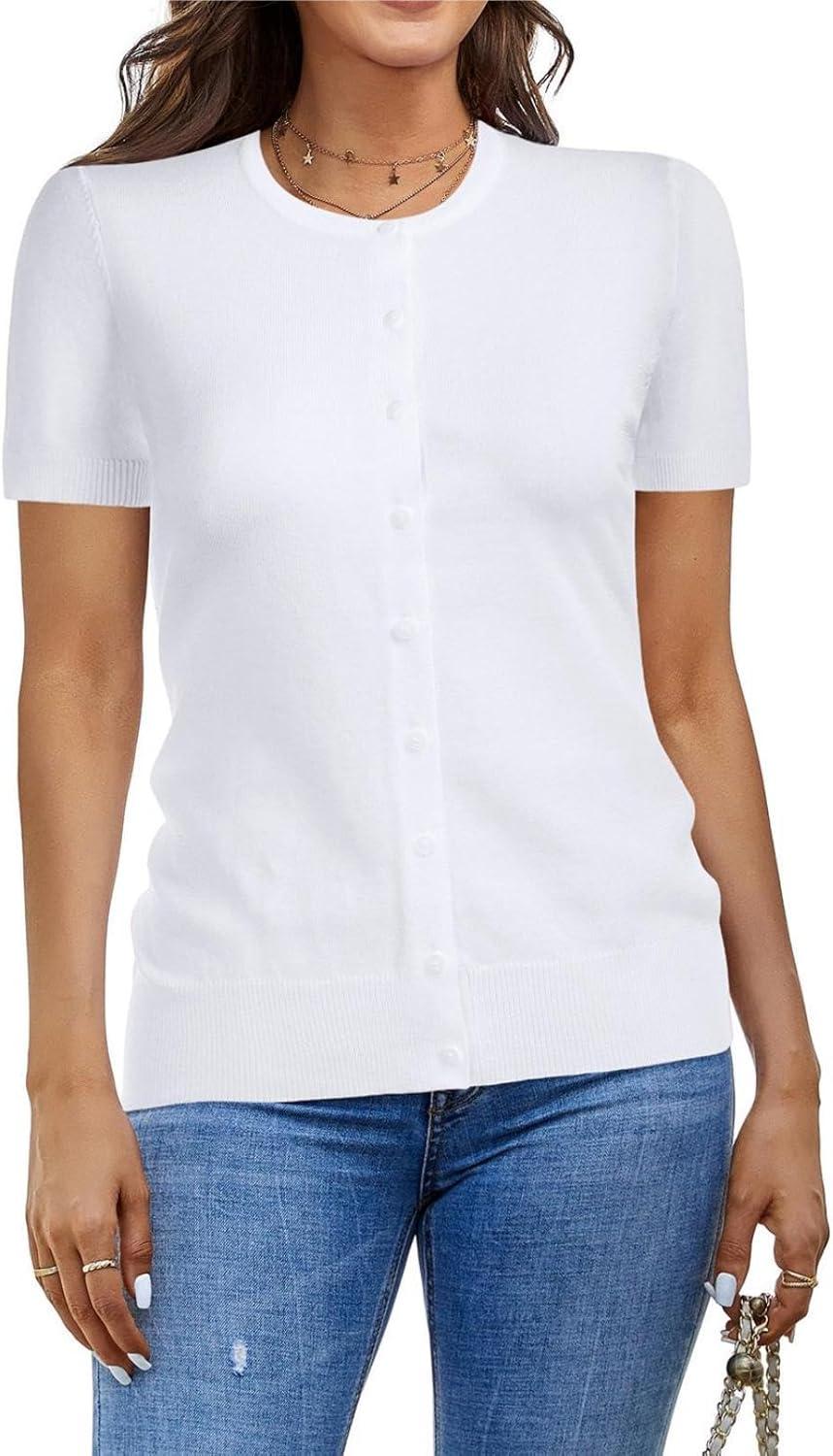 Womens Short Sleeve Cardigan Crew Neck Basic Casual Button Down Knit Soft Sweater(Bright White)