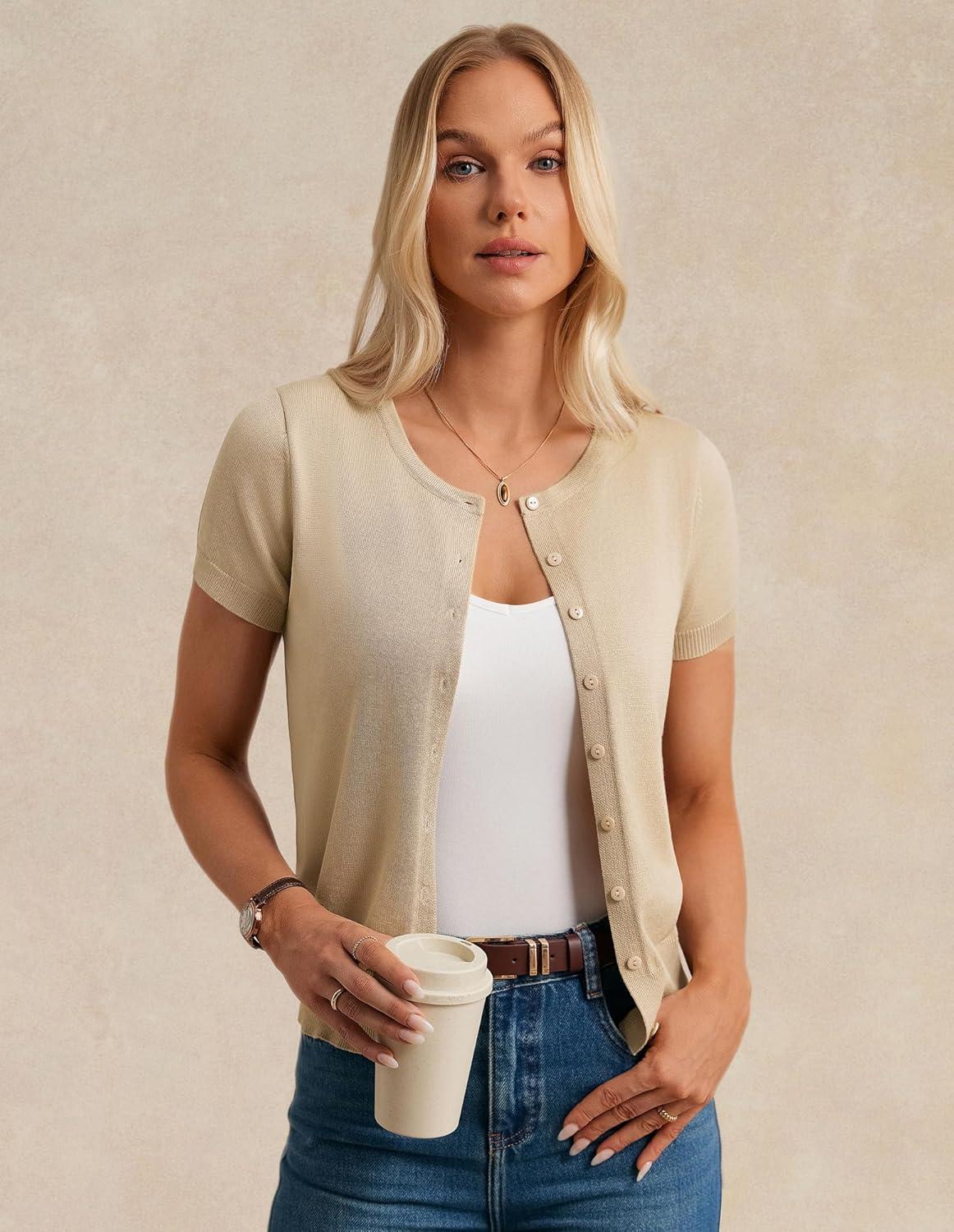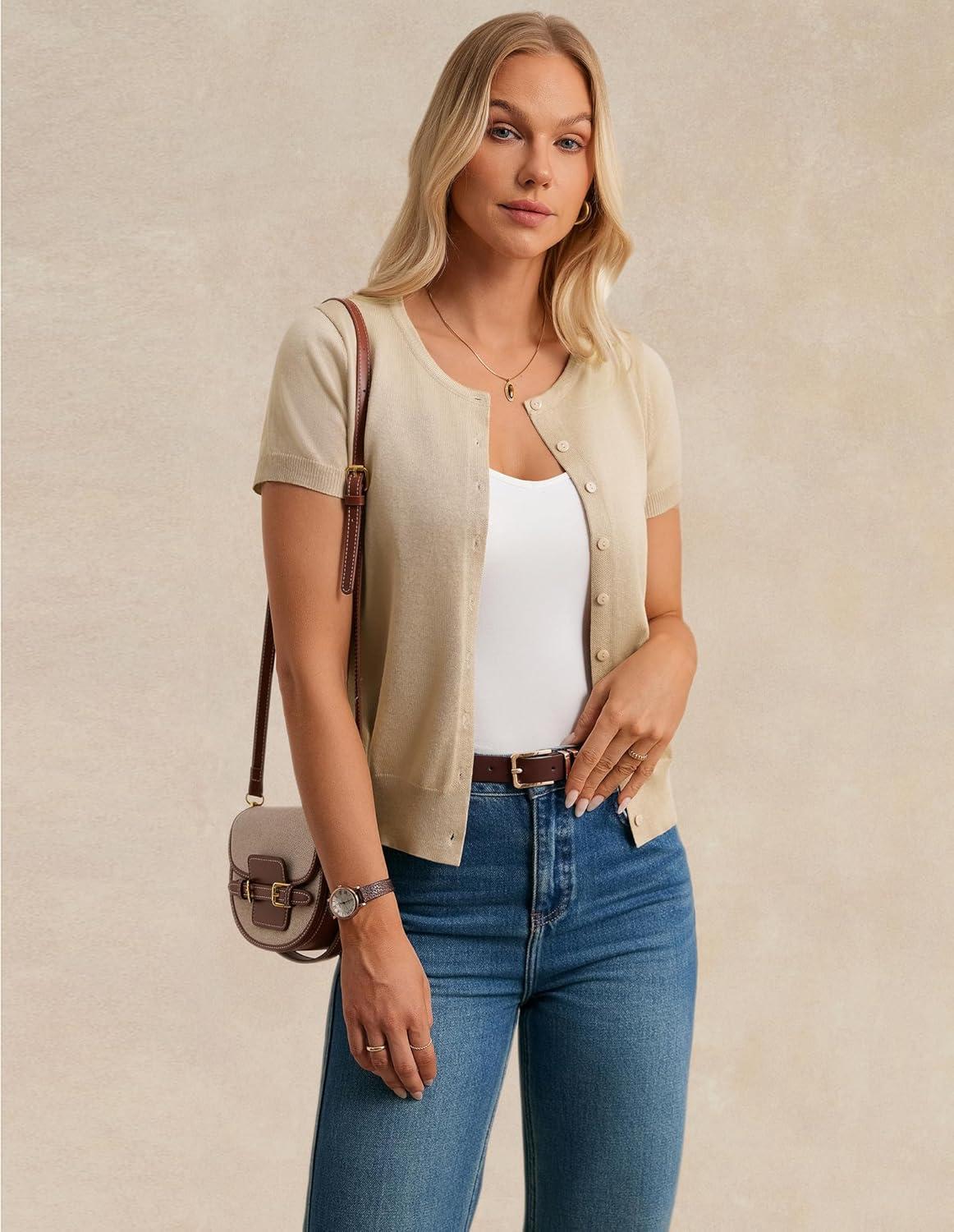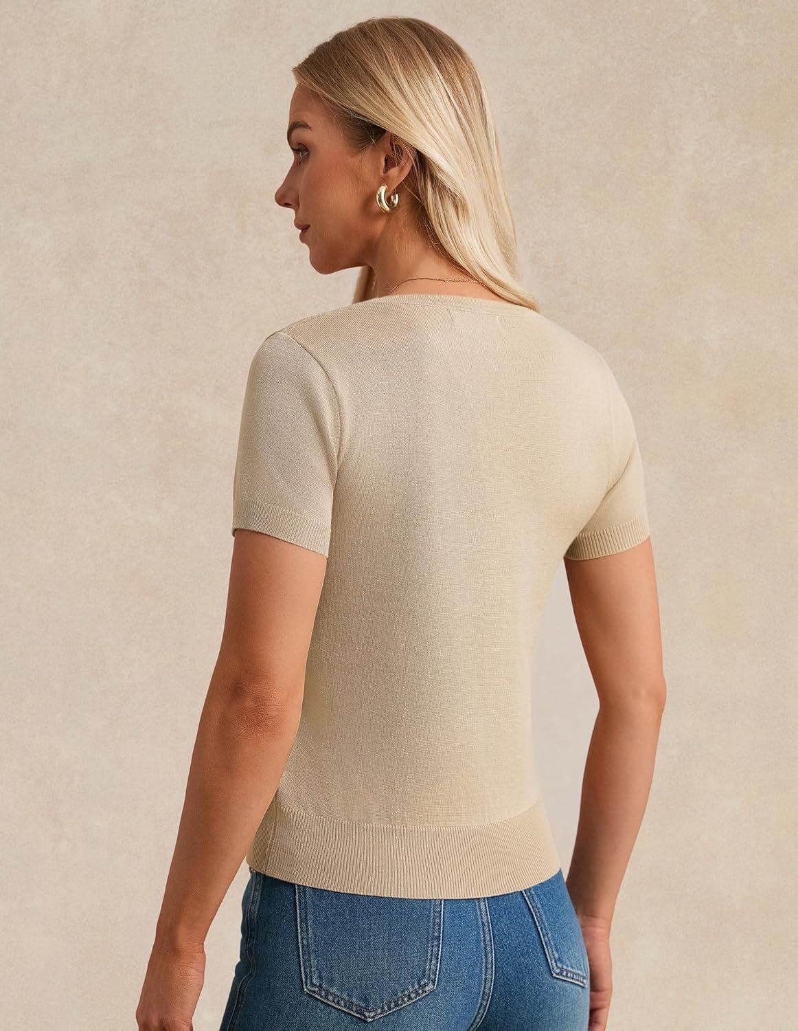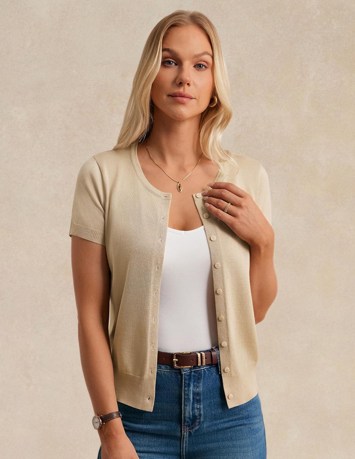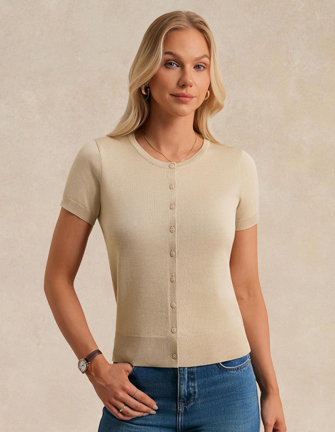 imageWomens Short Sleeve Cardigan Crew Neck Basic Casual Button Down Knit Soft SweaterLight Apricot
