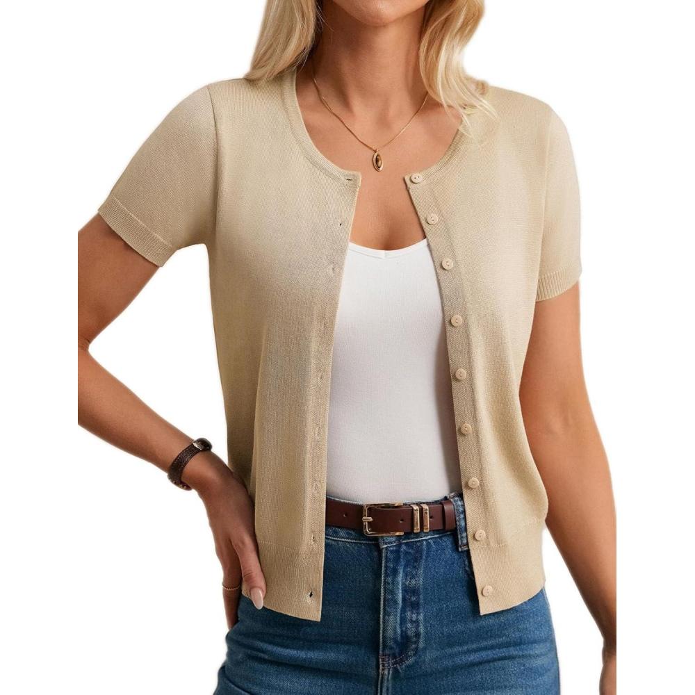 Womens Short Sleeve Cardigan Crew Neck Basic Casual Button Down Knit Soft Sweater(Khaki)