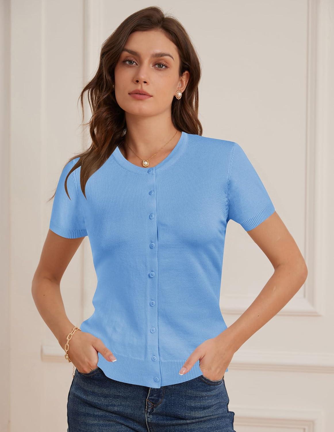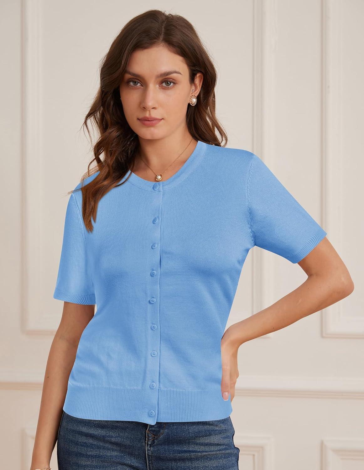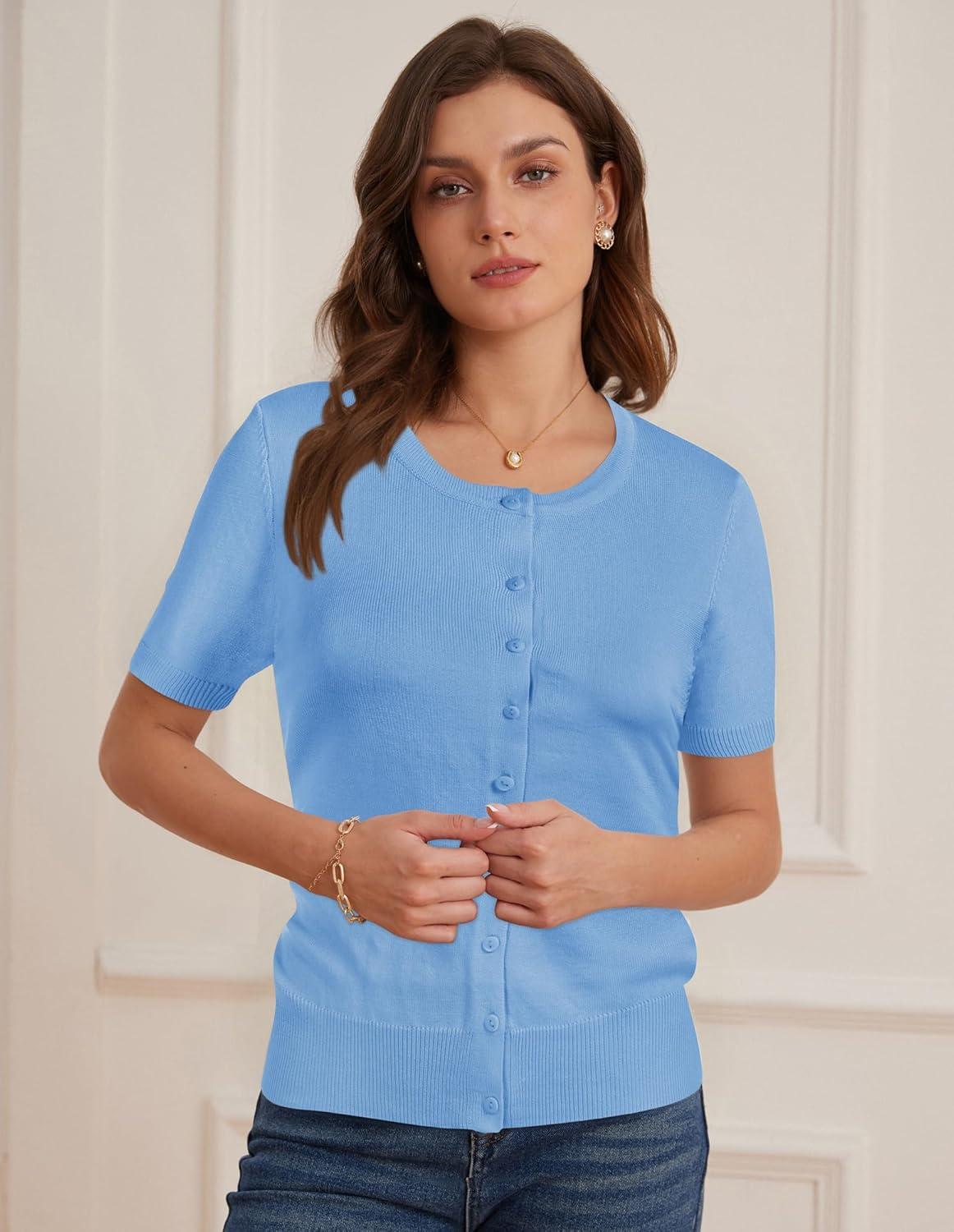 Womens Short Sleeve Cardigan Crew Neck Basic Casual Button Down Knit Soft Sweater(Light Blue)