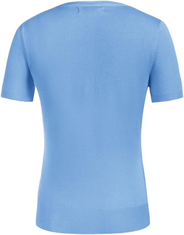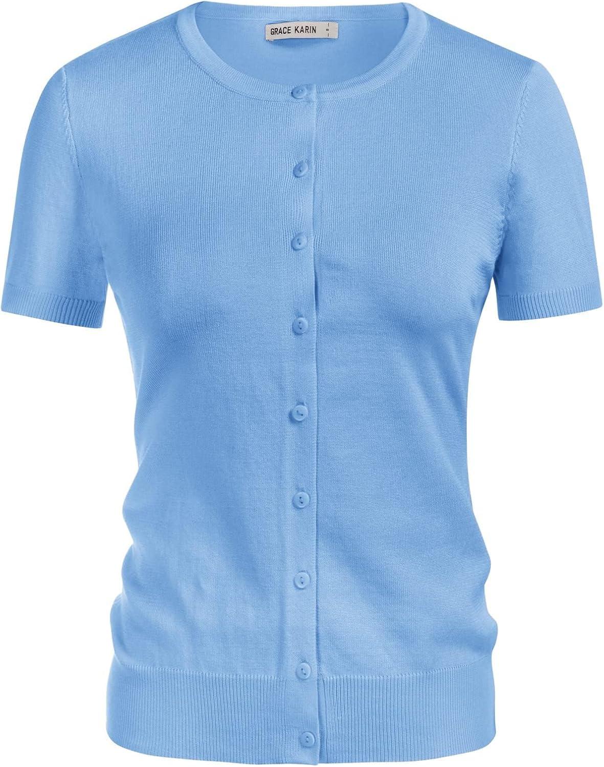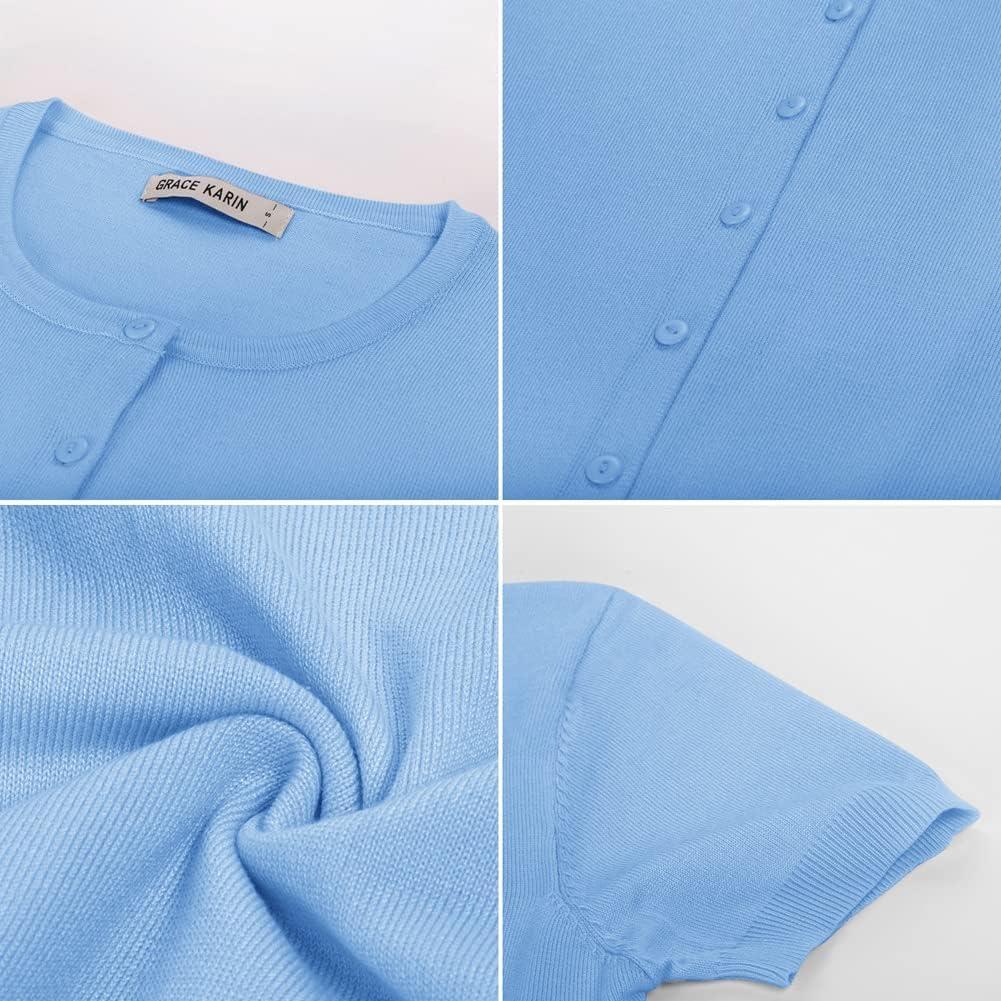 Womens Short Sleeve Cardigan Crew Neck Basic Casual Button Down Knit Soft Sweater(Light Blue)